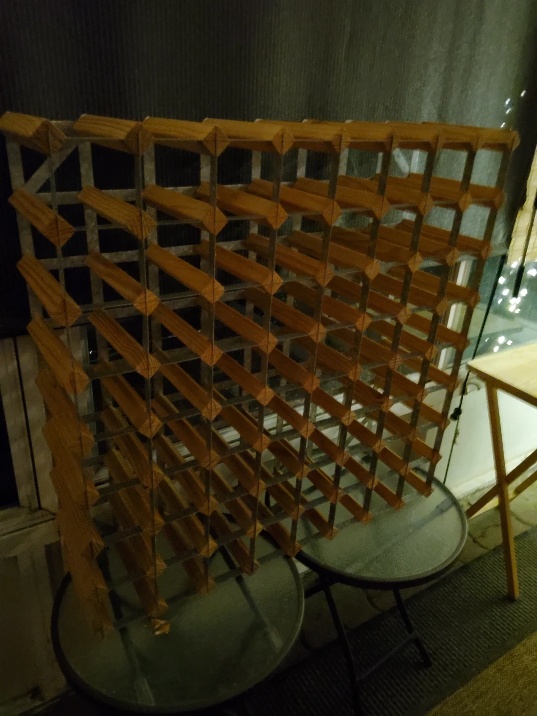 This is a wooden wine rack with a capacity for multiple bottles. It's constructed with a wood and metal frame. Suitable for home bar or cellar storage. Holds 72 bottles