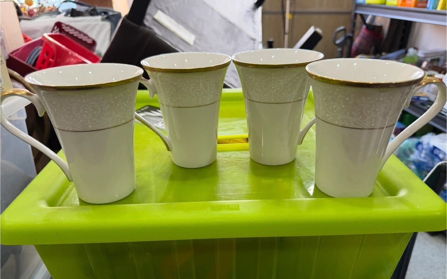 This set includes four white, tapered mugs with elegant gold trim. They feature a decorative patterned band near the rim. These mugs are perfect for enjoying your morning coffee or tea. Ceramic material.