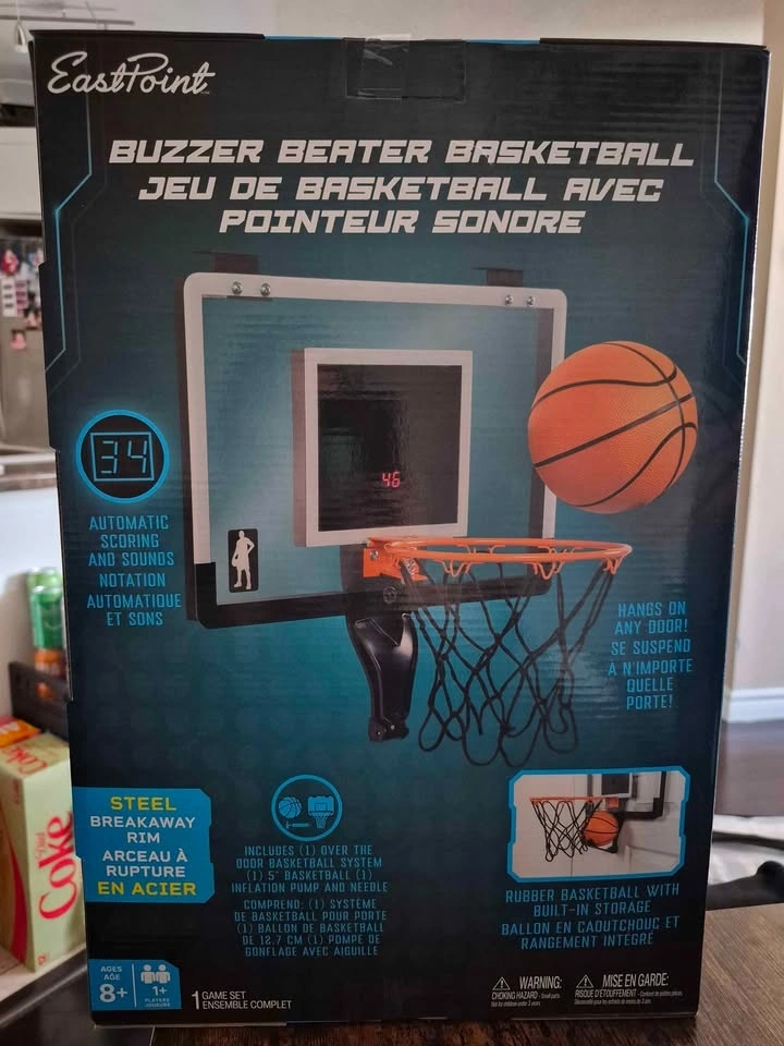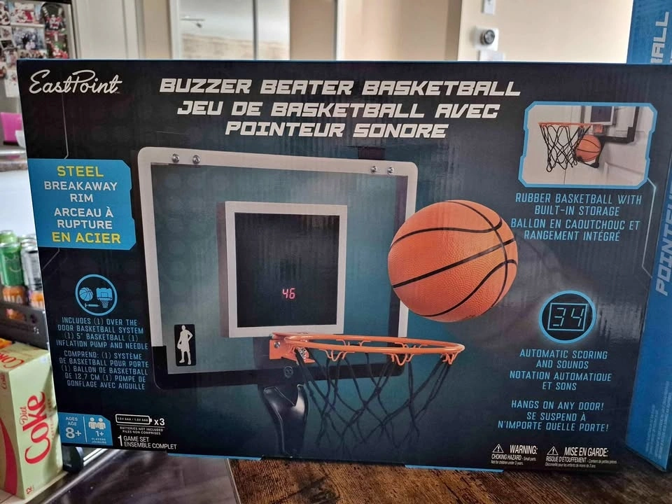 Brand new, giftable. 3 available for $40 each. Steel rim fits on all doors. Comes with a rubber basketball and built-in storage. Features auto scoring and sounds. Requires 3 AAA batteries. Located in Derry & McLaughlin.