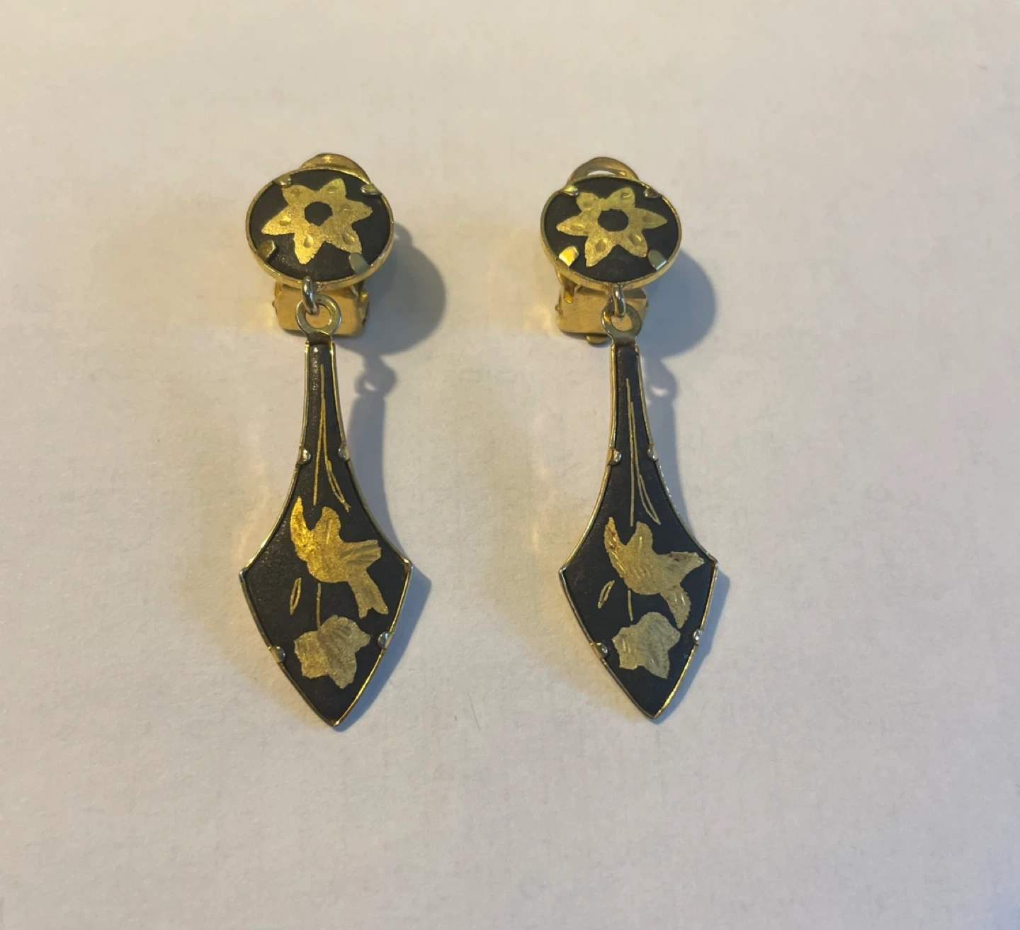A pair of vintage clip-on earrings with a black and gold floral design. These earrings have a dangling diamond-shaped lower section with gold leaf accents.