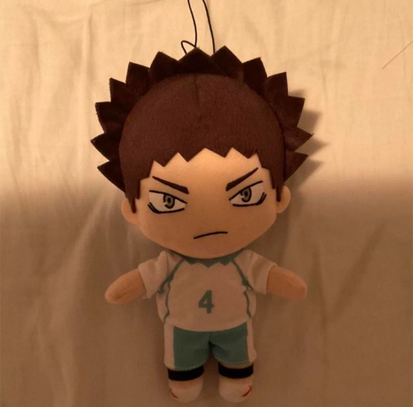 This is a plush toy of Iwaizumi from Haikyuu!!. It's made of soft material and features his signature jersey with the number 4. Perfect for any anime fan's collection!