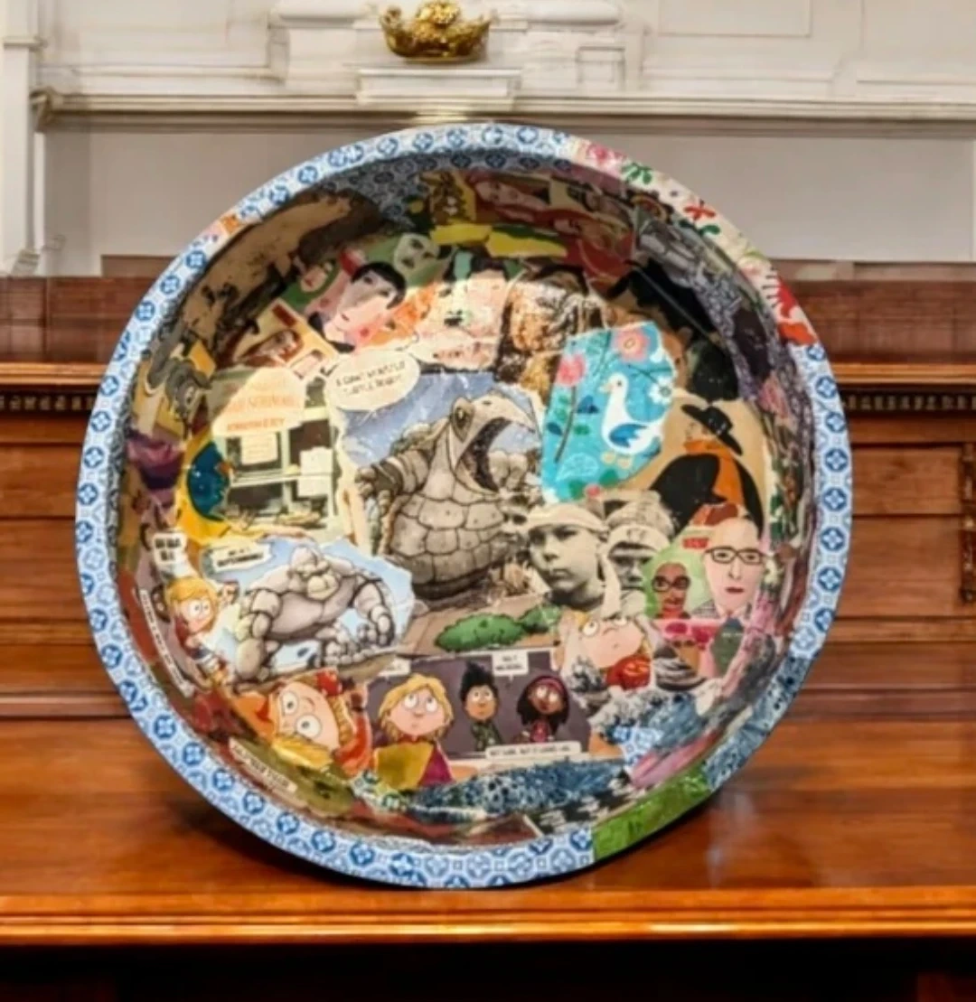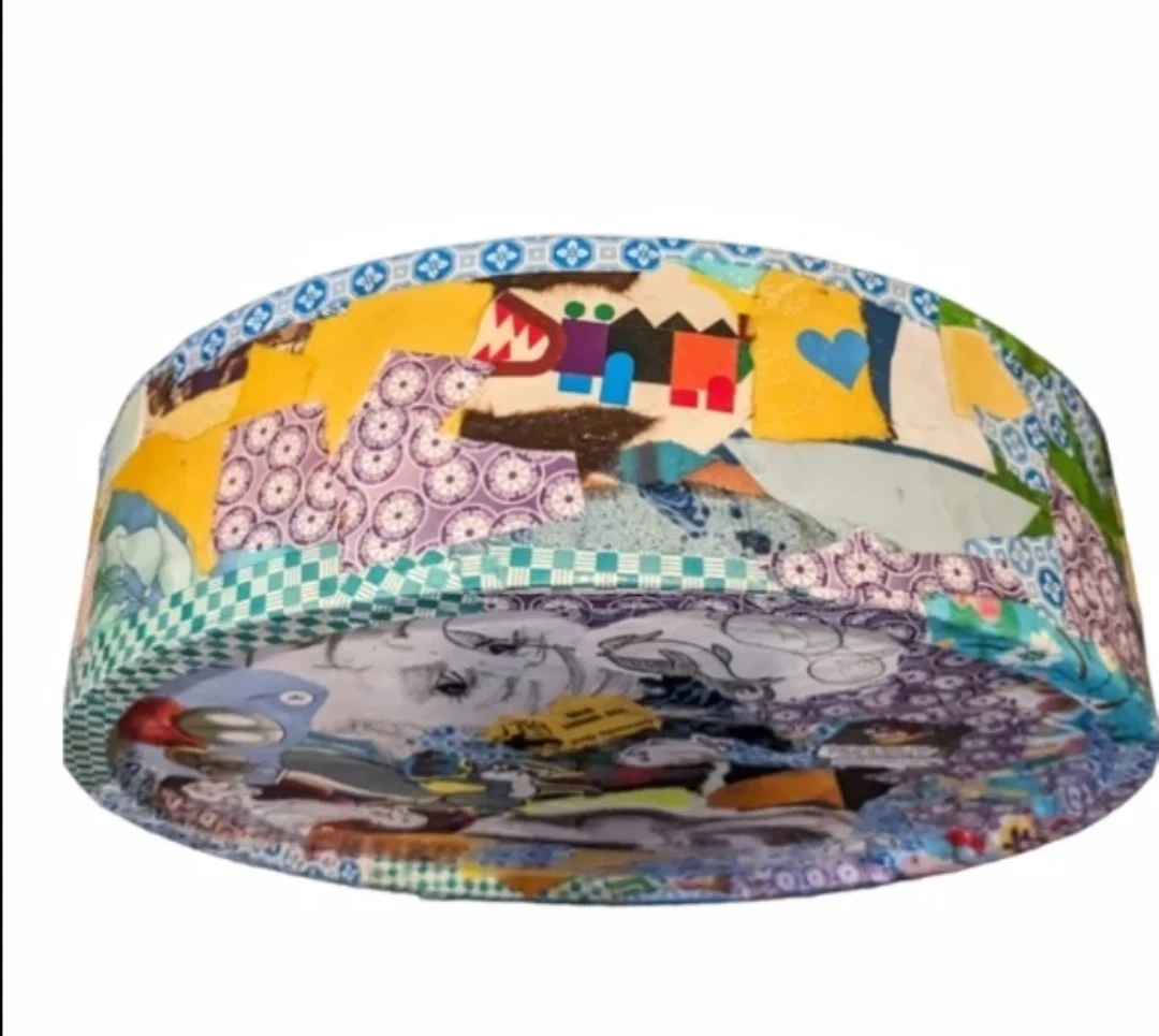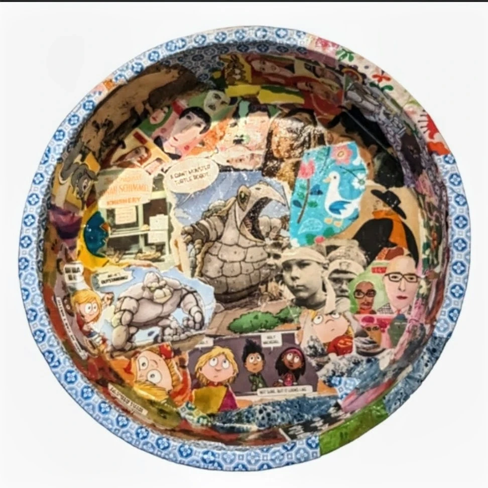 Entirely crafted with decoupage; This includes Original etchings, Watercolors, Marble paper, Photography, Fabric and hand picked color collage.