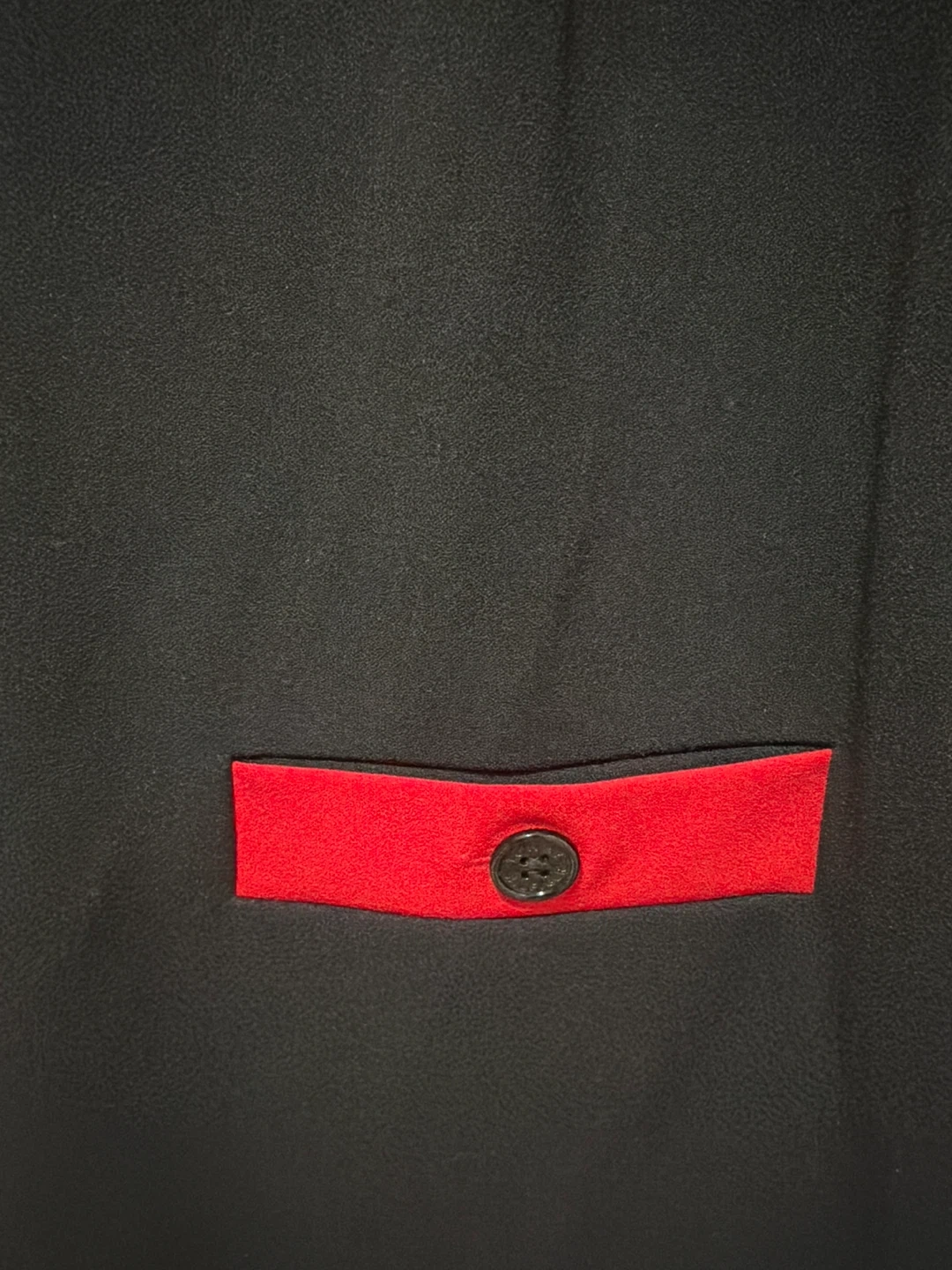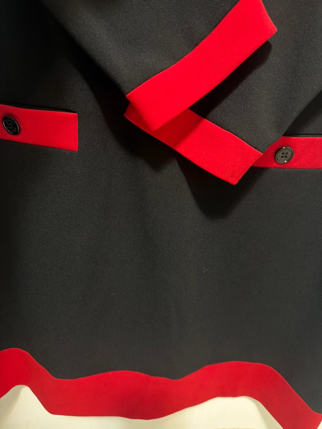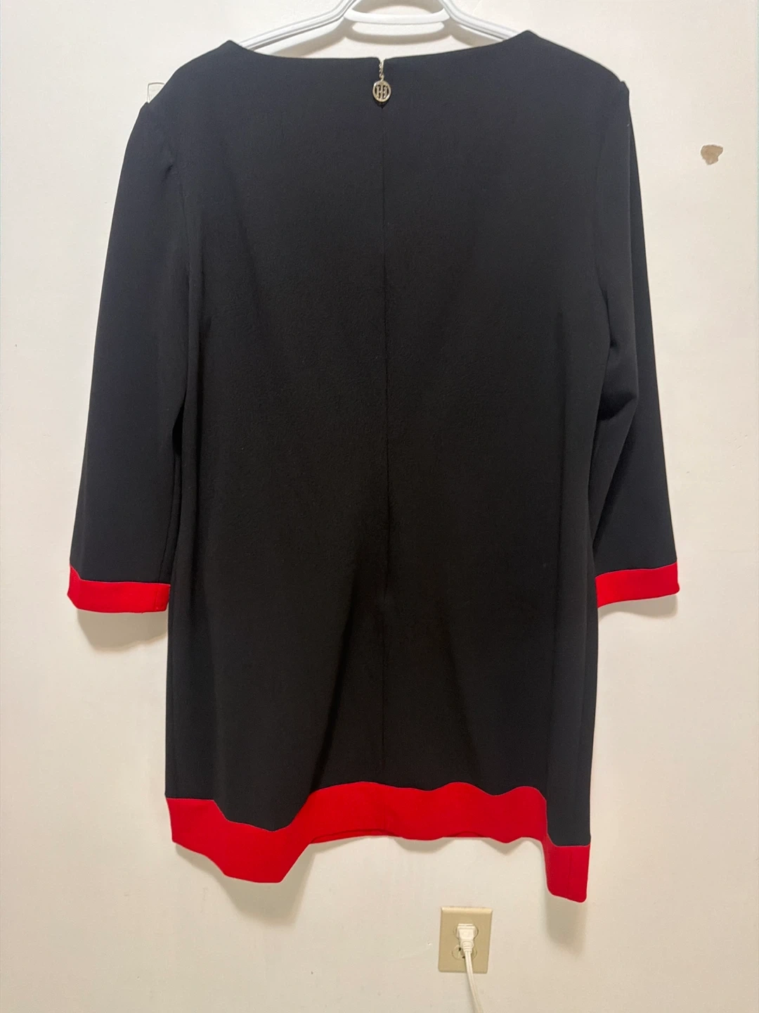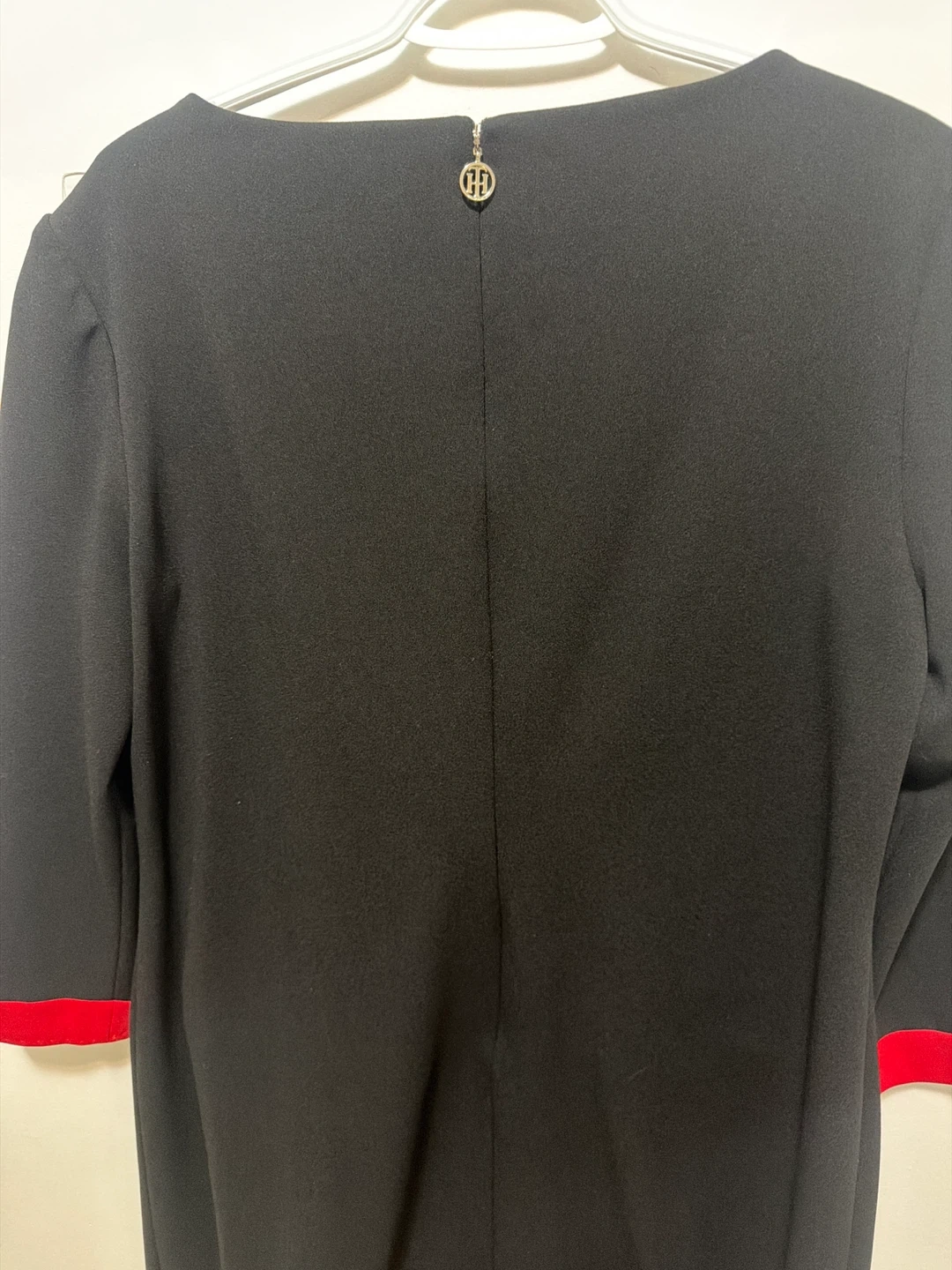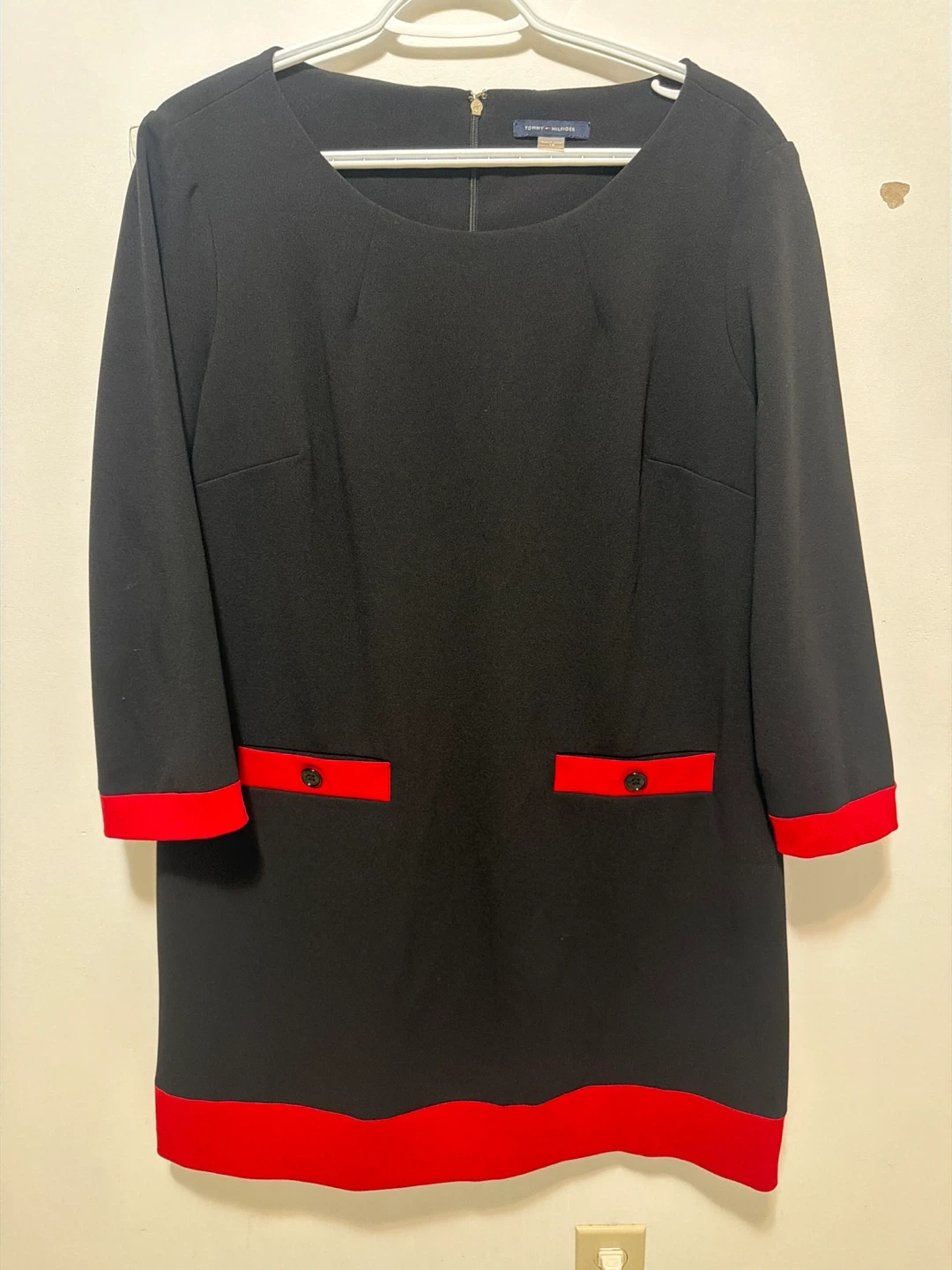 This is a Tommy Hilfiger black dress with red trim accents on the sleeves and hem. It features decorative pocket flaps with buttons. The dress is a size 16.