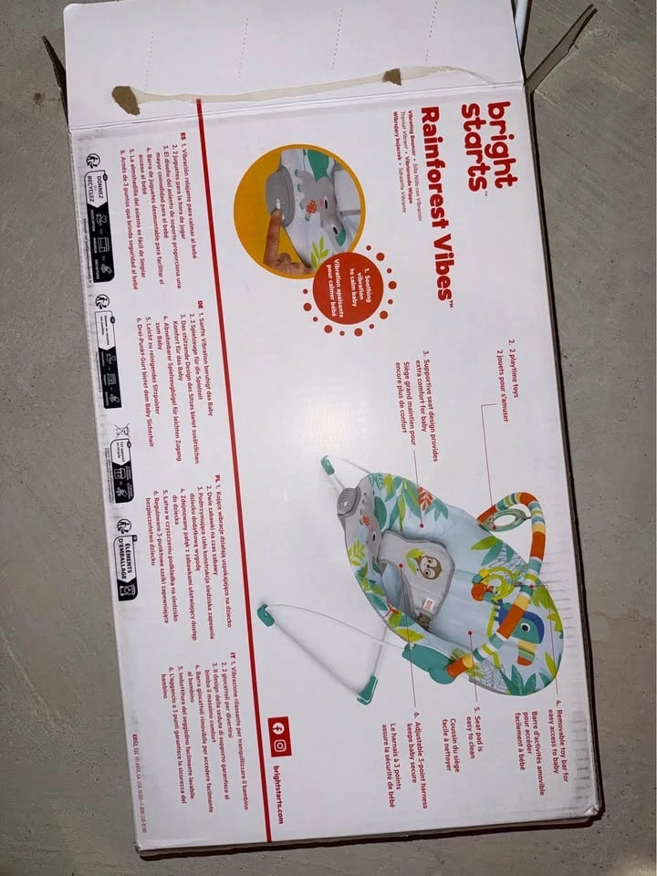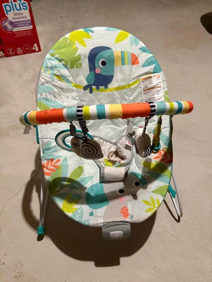 Selling a Bright Starts Rainforest Vibes baby bouncer in great condition. This was barely used and comes from a clean, smoke-free home. Features: Soothing Vibrations: Includes a battery-operated vibration setting to help calm and soothe baby. Removable Toy Bar: Easy to take off with one hand for quick access to baby; includes two colorful hanging toys (snail and bird). Comfortable Design: Features a deep, supportive seat with a 3-point safety harness. Easy to Clean: The seat pad is machine washable. Original Box Included: Great for transport or gifting. Condition: Like New / Excellent. No stains, tears, or wear on the fabric.