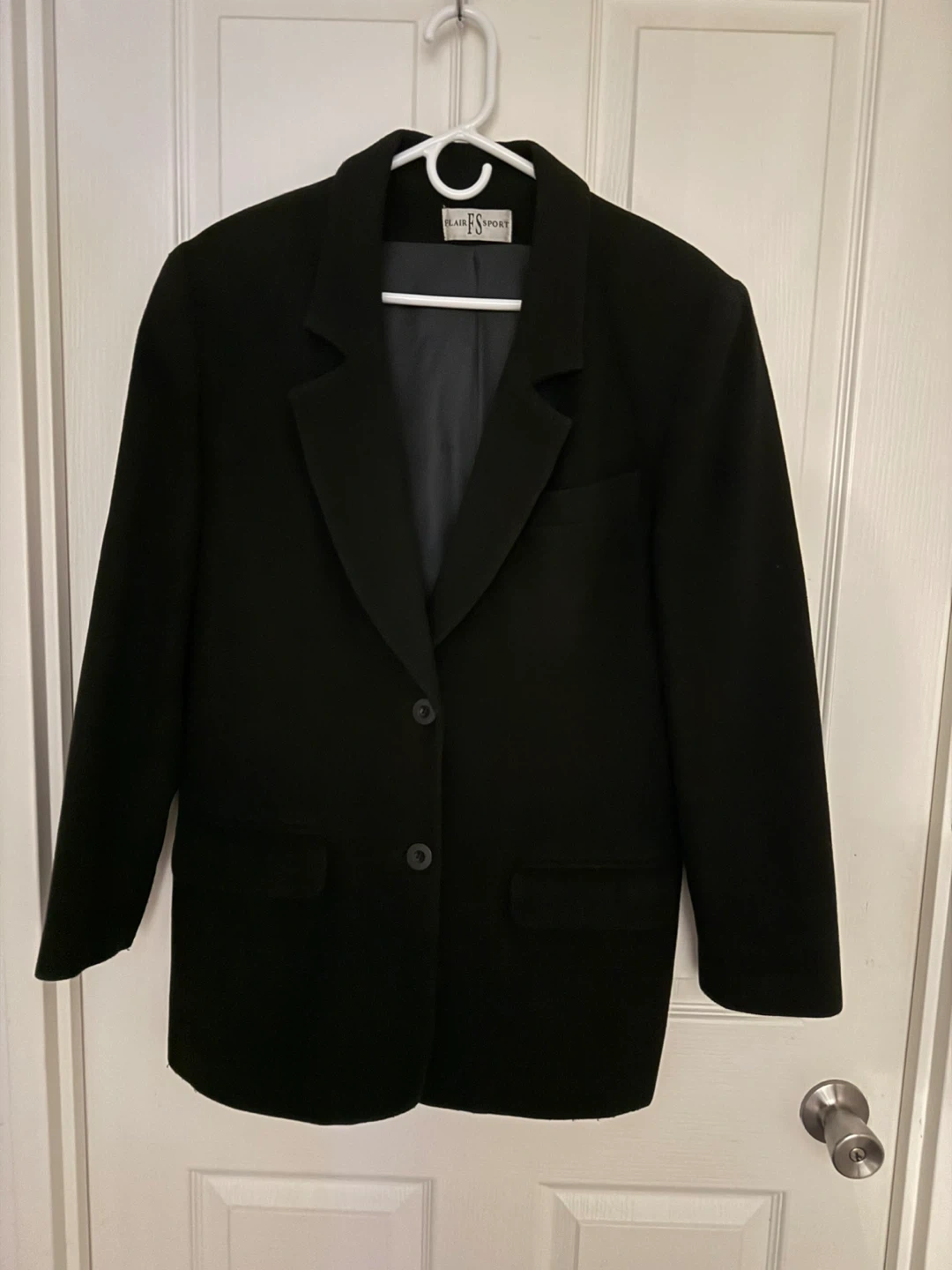 Black blazer from Flair Sport. Made with a wool blend: 75% wool, 20% nylon, 5% cashmere. Lining is 100% rayon. Size is 10.