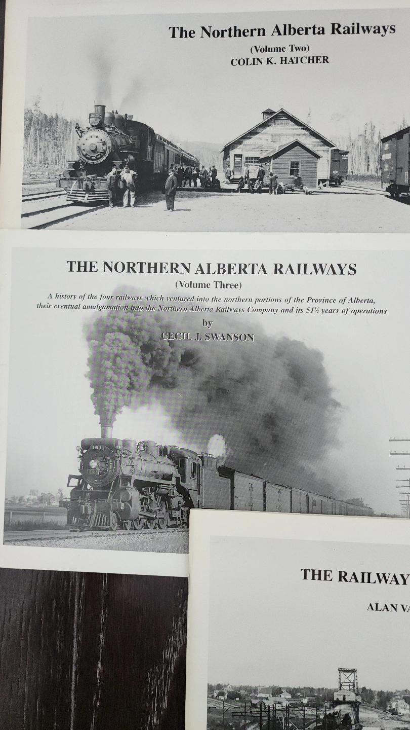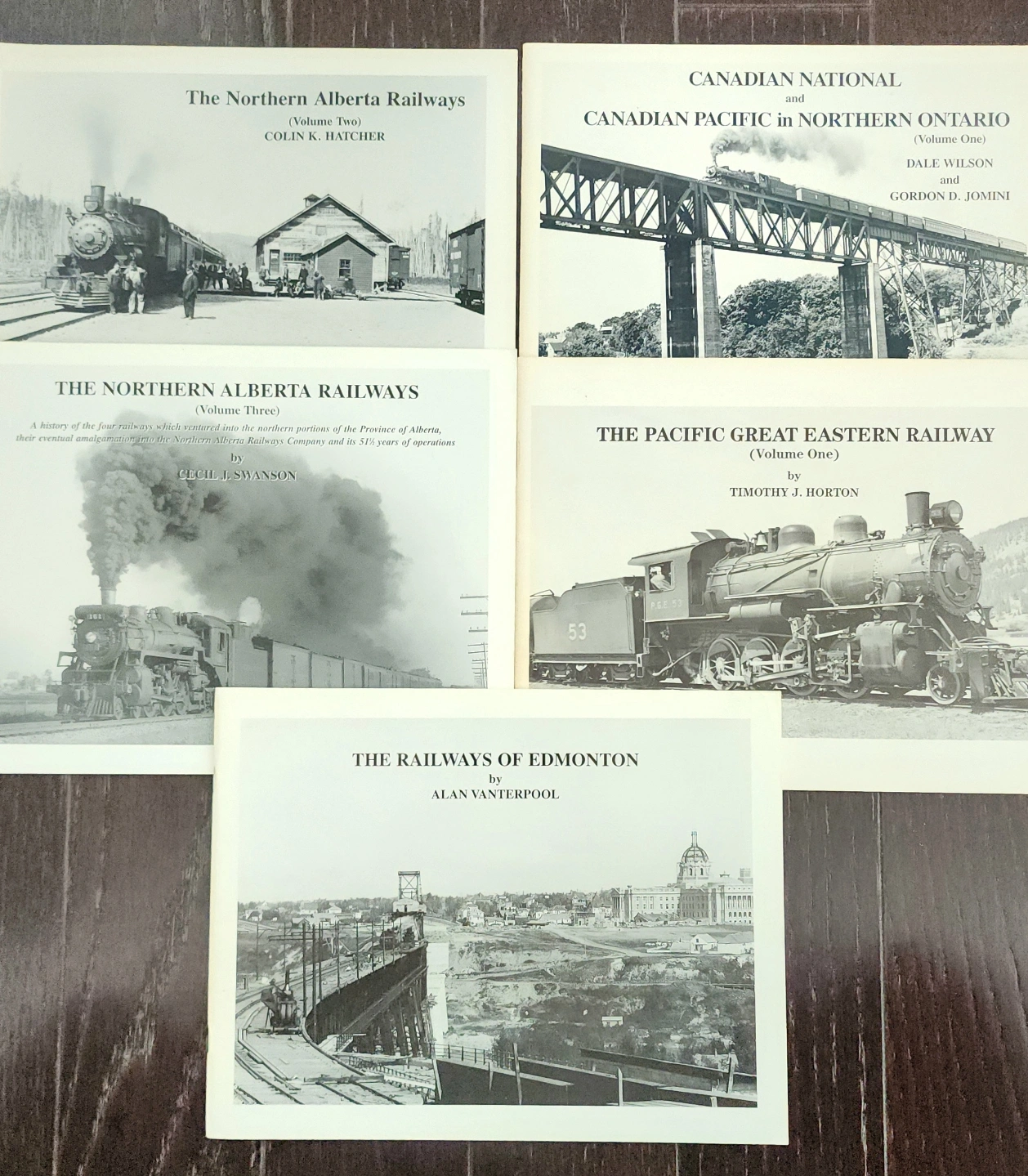 Set of vintage railway books. Includes volumes on Canadian National and Canadian Pacific in Northern Ontario, The Pacific Great Eastern Railway, and The Northern Alberta Railways. Black and white photos throughout. Great for railway enthusiasts or collectors. 5 magazines in great condition.