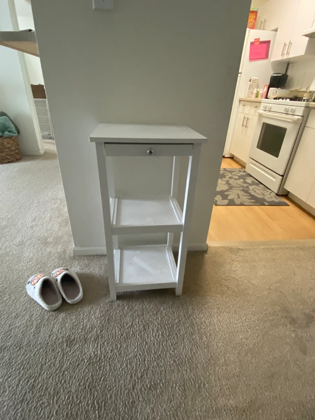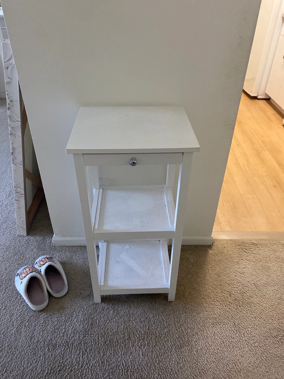 This white accent table features a single drawer for storage and two open shelves below. It's a compact solution for organizing small spaces. The simple design makes it versatile for various rooms.