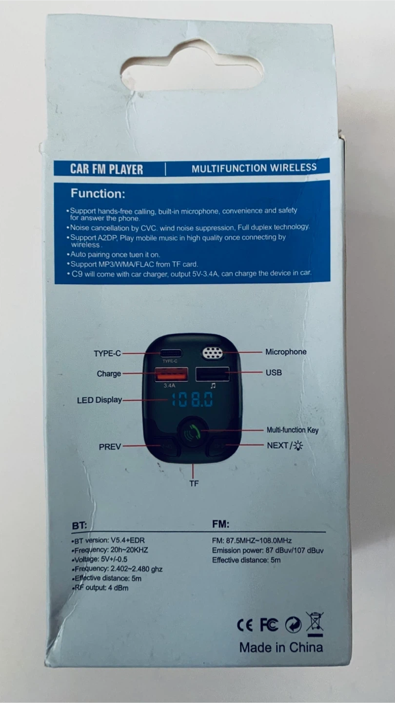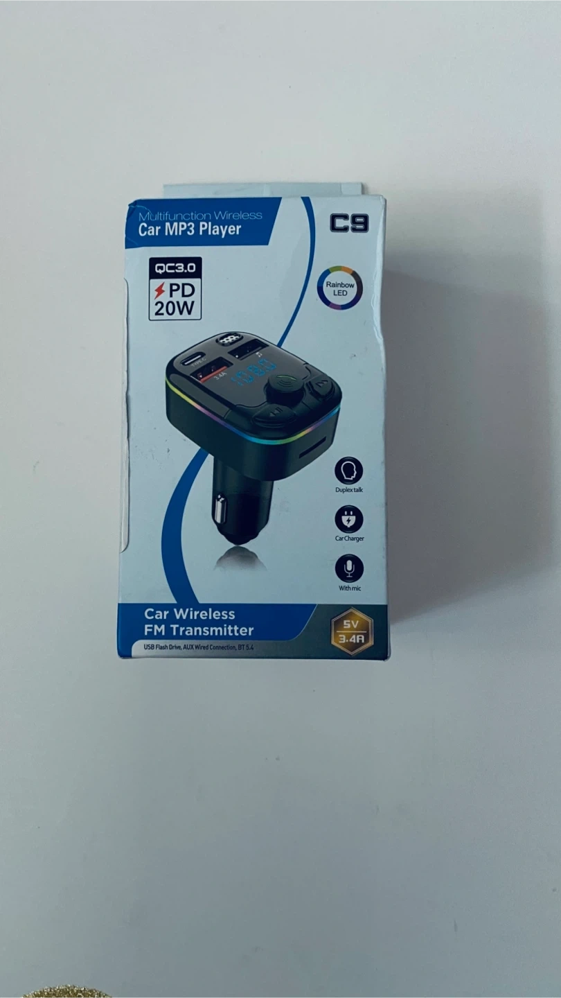 This car MP3 player functions as an FM transmitter. It supports QC3.0 and PD 20W charging. Includes hands-free calling with built-in mic and noise cancellation.