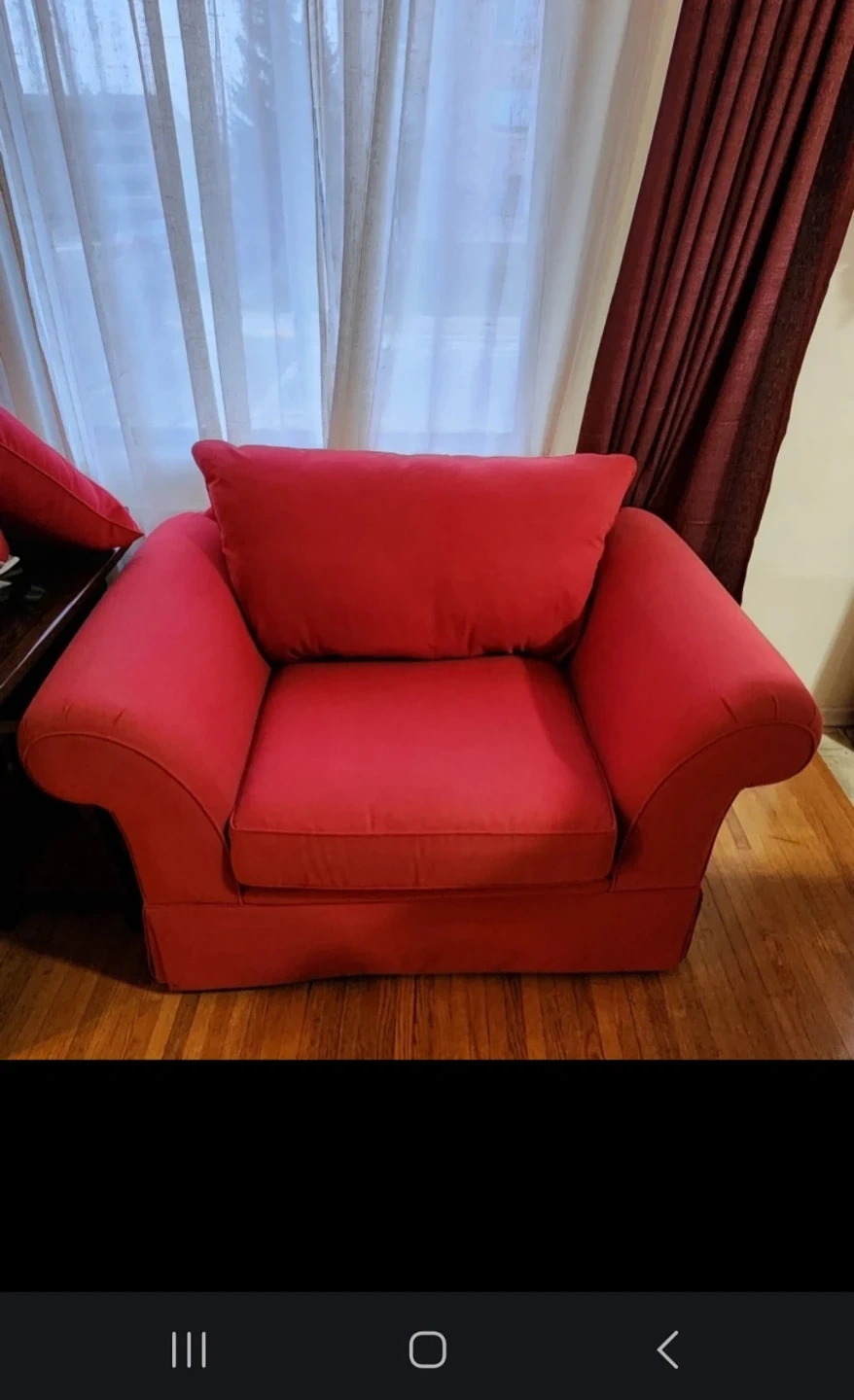 Comfortable red armchair with plush cushions. It's a cozy addition to any living space. Great for reading or relaxing! Must be able to pick up in West End of Downtown in Sunalta SW area