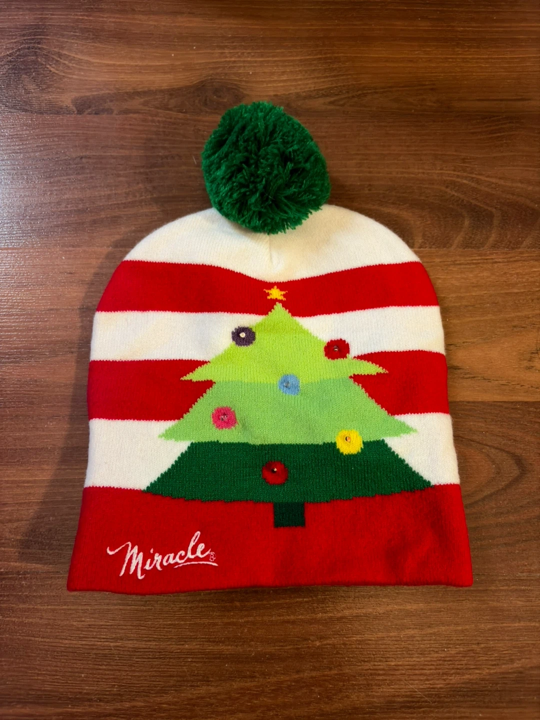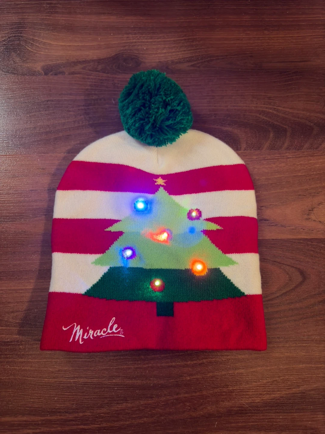 This festive beanie features a classic Christmas tree design with colourful, light-up ornaments. It has alternating red and white stripes on the top and a red brim with the 'Miracle' logo. It's a fun accessory for holiday gatherings!