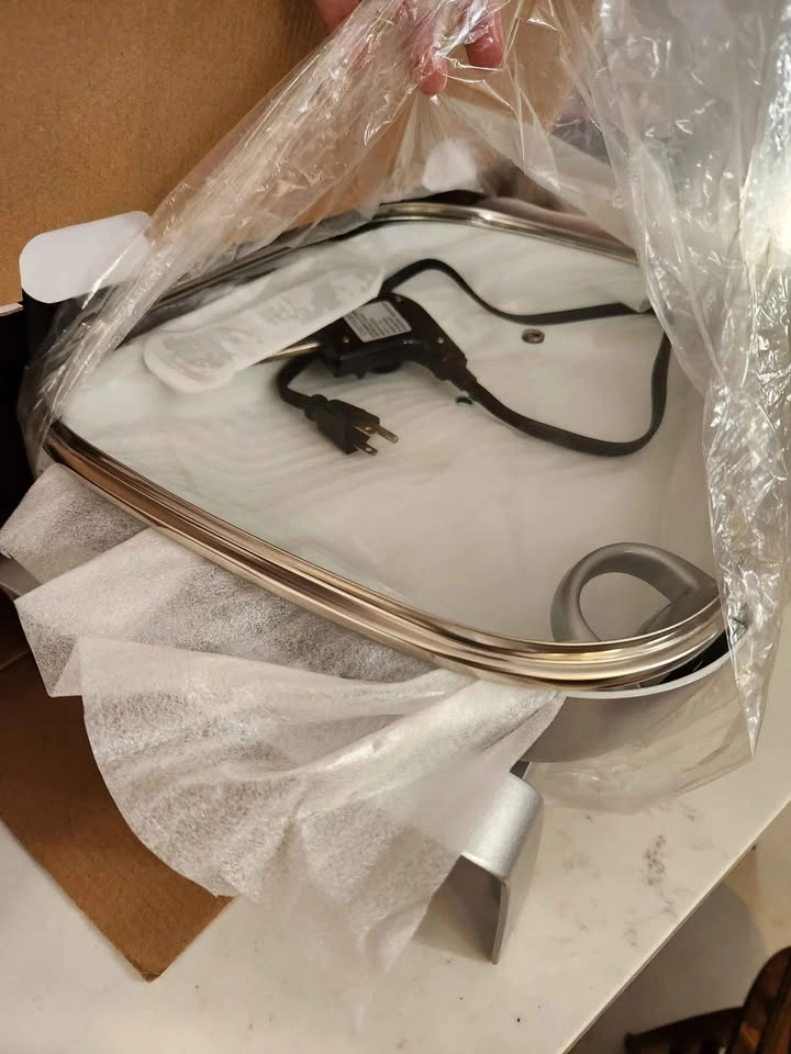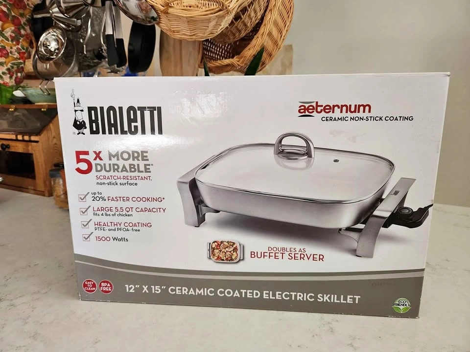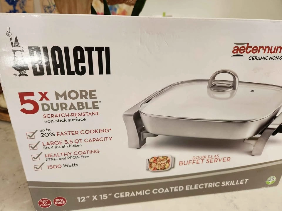 Bialetti 12x15" ceramic coated electric skillet and buffet server. It was a wedding present that's been in storage for years, then I took it out and used it once, but I really don't have room in my kitchen for more appliances so I packed it back up and it's just been sitting in it's box. It can be a really handy thing to have. My MIL uses her all the time for big batch cooking and buffet serving. I just haven't used it and need to clear up space in my kitchen and storage. Pickup in Lisle.