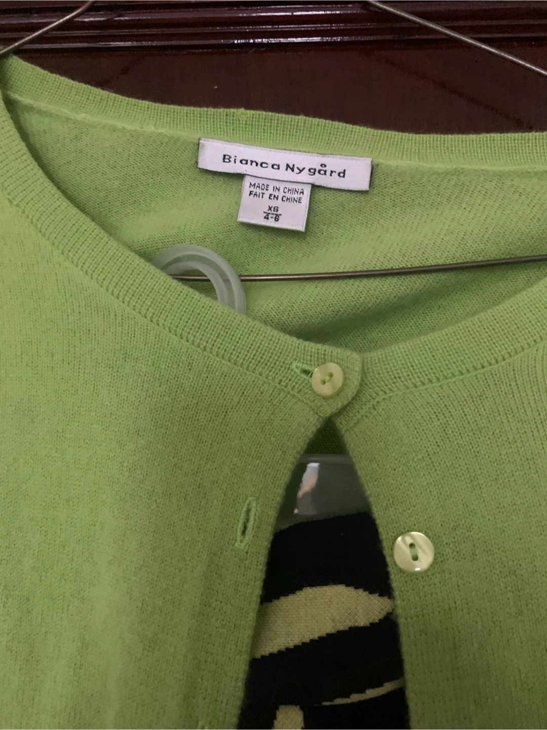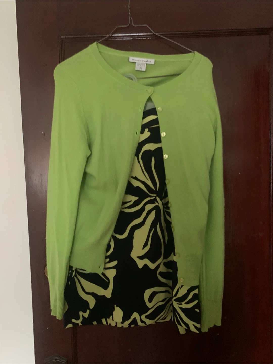 Selling a lovely outfit , cardigan in a vibrant green colour ,made of 100% cashmere, super soft and comfy and a skirt that matches it and together make a perfect outfit for work.
