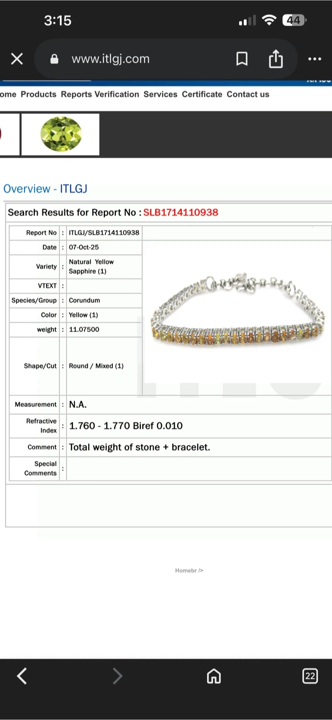 Here's a lovely yellow sapphire tennis bracelet. The sapphire is natural yellow corundum. The total weight of the stone and bracelet is 11.07500.