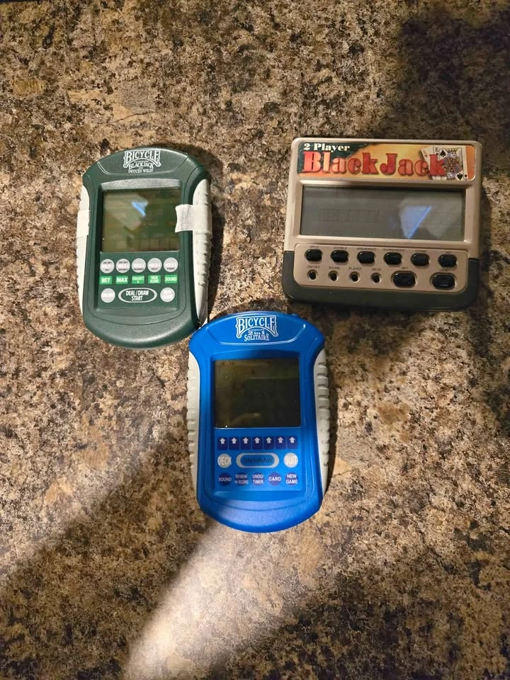I'm offering a set of three Bicycle handheld electronic games, perfect for card game enthusiasts on the go. These are used items, but they're ready to provide hours of entertainment. * Includes Blackjack, Solitaire, and Draw Poker games * Compact and portable for travel Finding these games in good condition is like finding a royal flush – pretty rare! So, grab them while you can. If the ad's up, the games are available