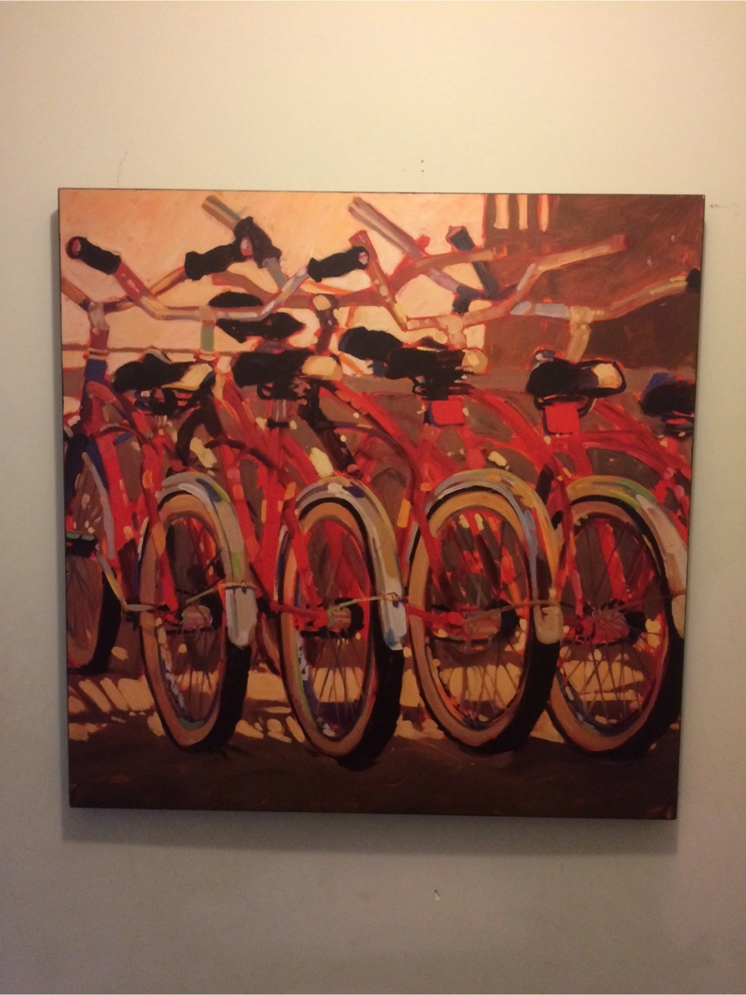 This is a painting of bicycles. The painting features a row of red bicycles with black seats and handlebars, set against a warm, muted background. It would be a great addition to any room
