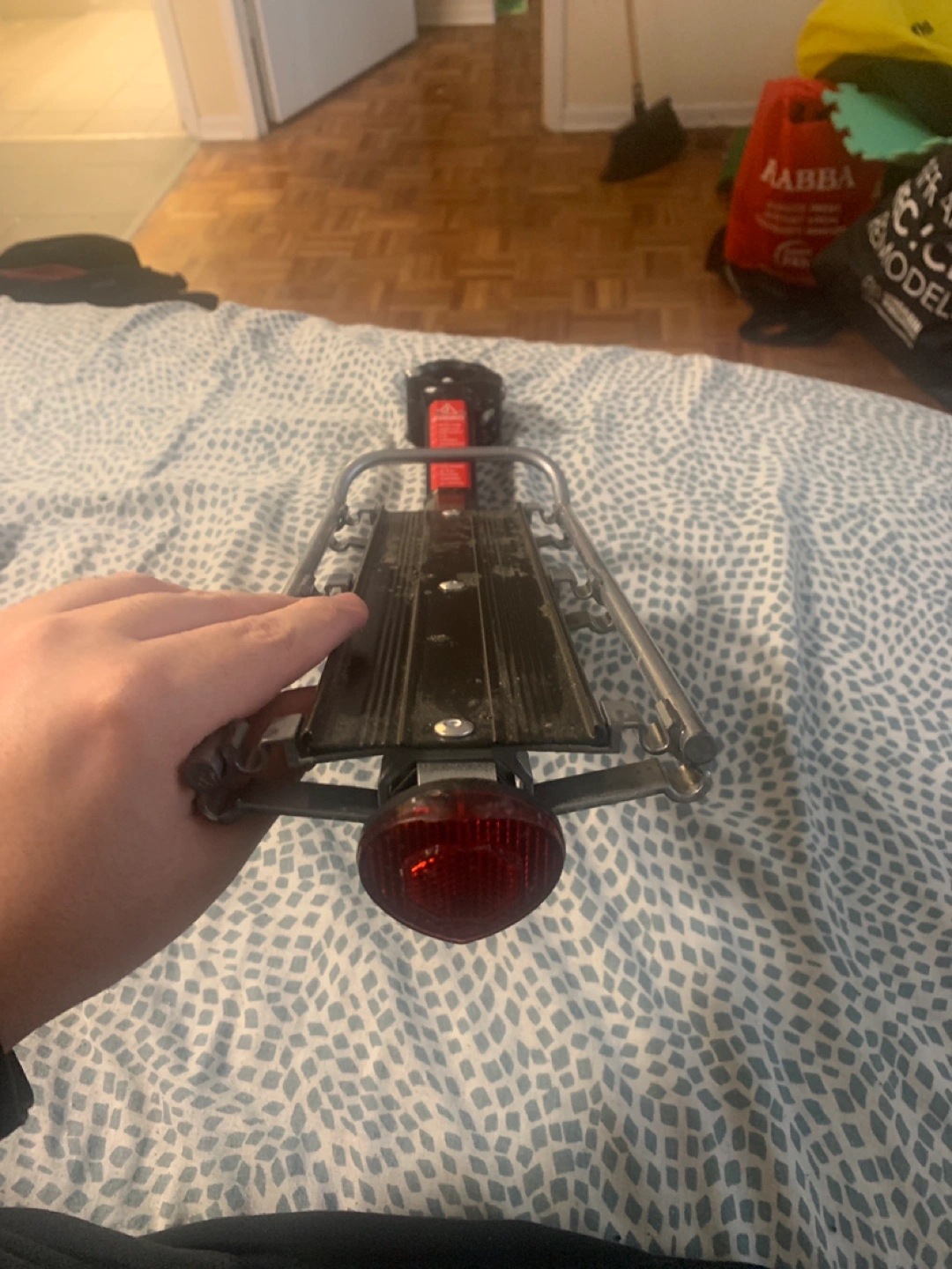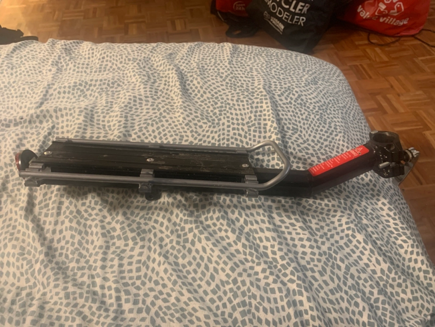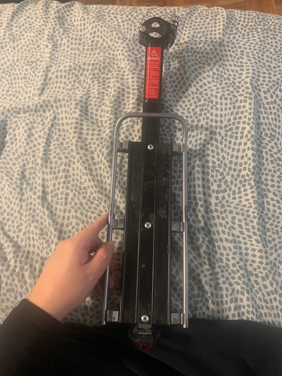 73Used bicycle rear rack. Features a built-in red reflector light. Aluminium and steel construction. Shows some wear from use. Basket costed me 10$ and the rack costed me 30$ plus shipping. Come with rope i used to secure it to back of bike.