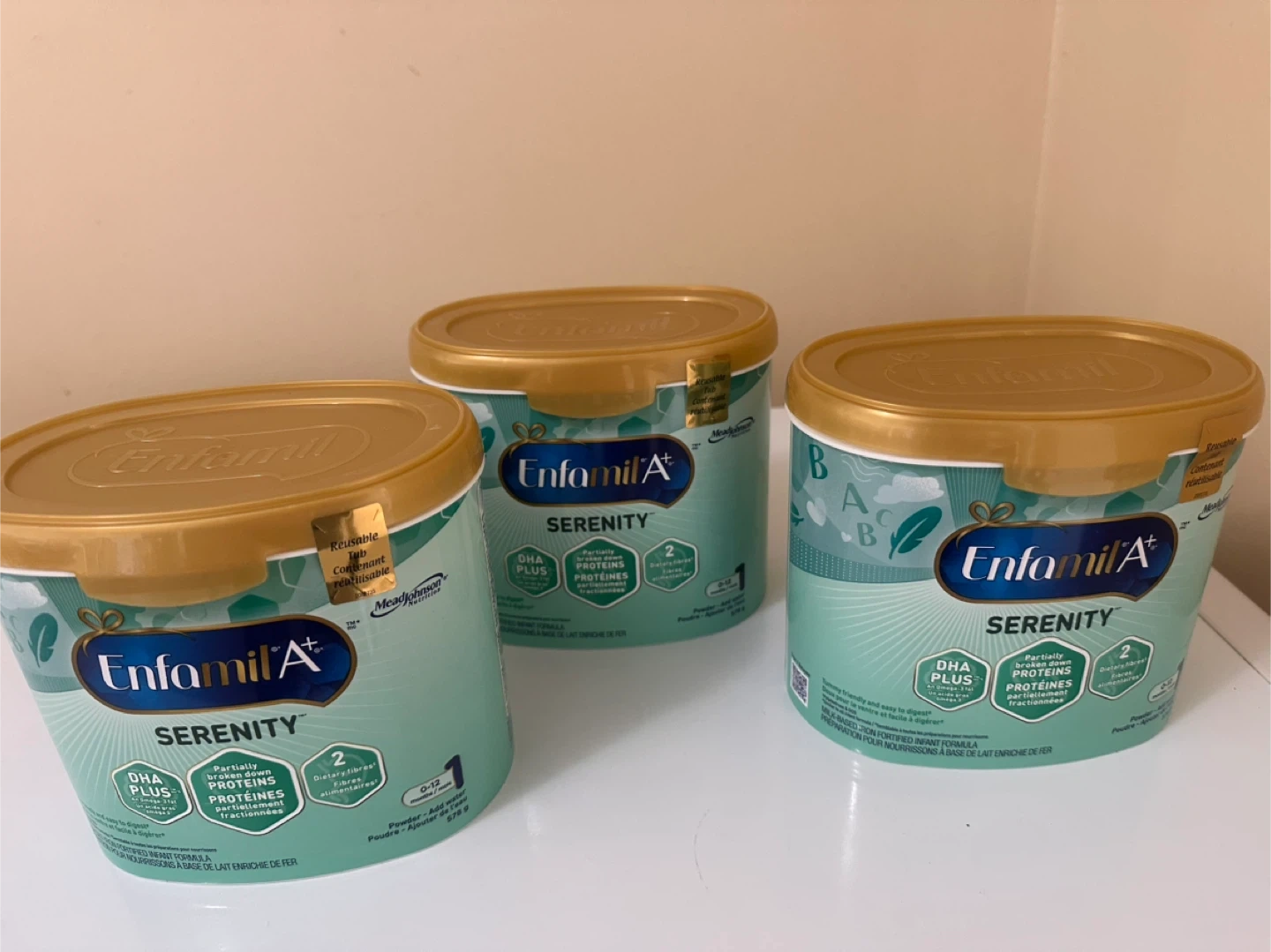 Three tubs of Enfamil A+ Serenity infant formula. Each tub is 578g and features DHA Plus and partially broken down proteins. These are milk-based formulas for infants 0-12 months.