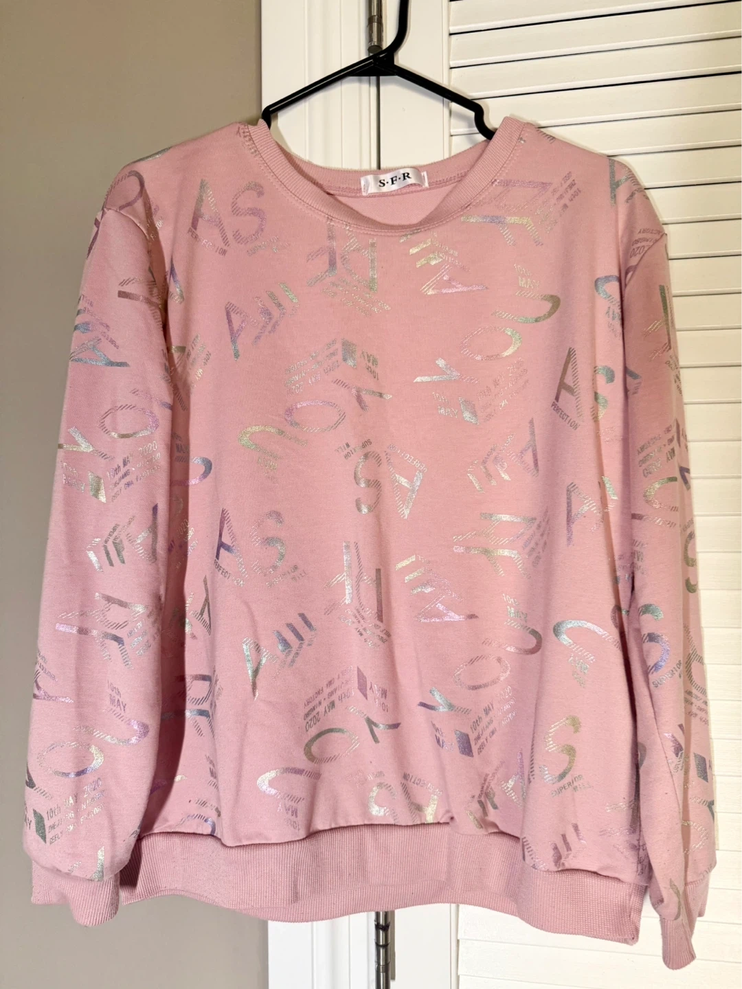 This is a pink sweatshirt from SFR with a repeating graphic print. It's made of 100% cotton. The graphic includes text and numbers. It has a crew neck and long sleeves with cuffed wrists and hem. Only worn twice.