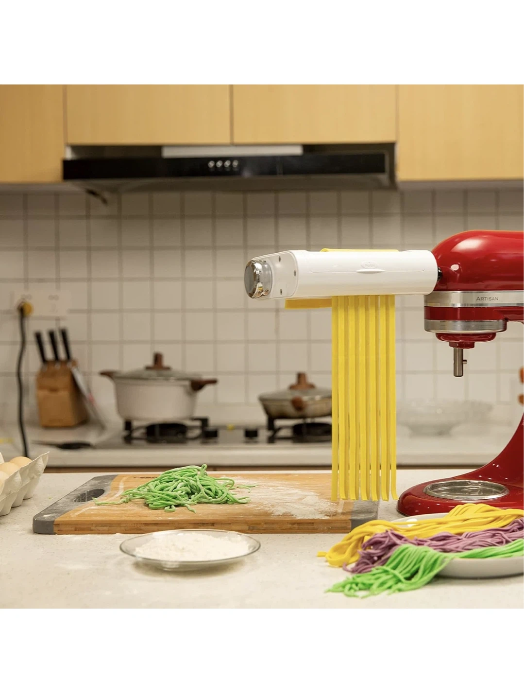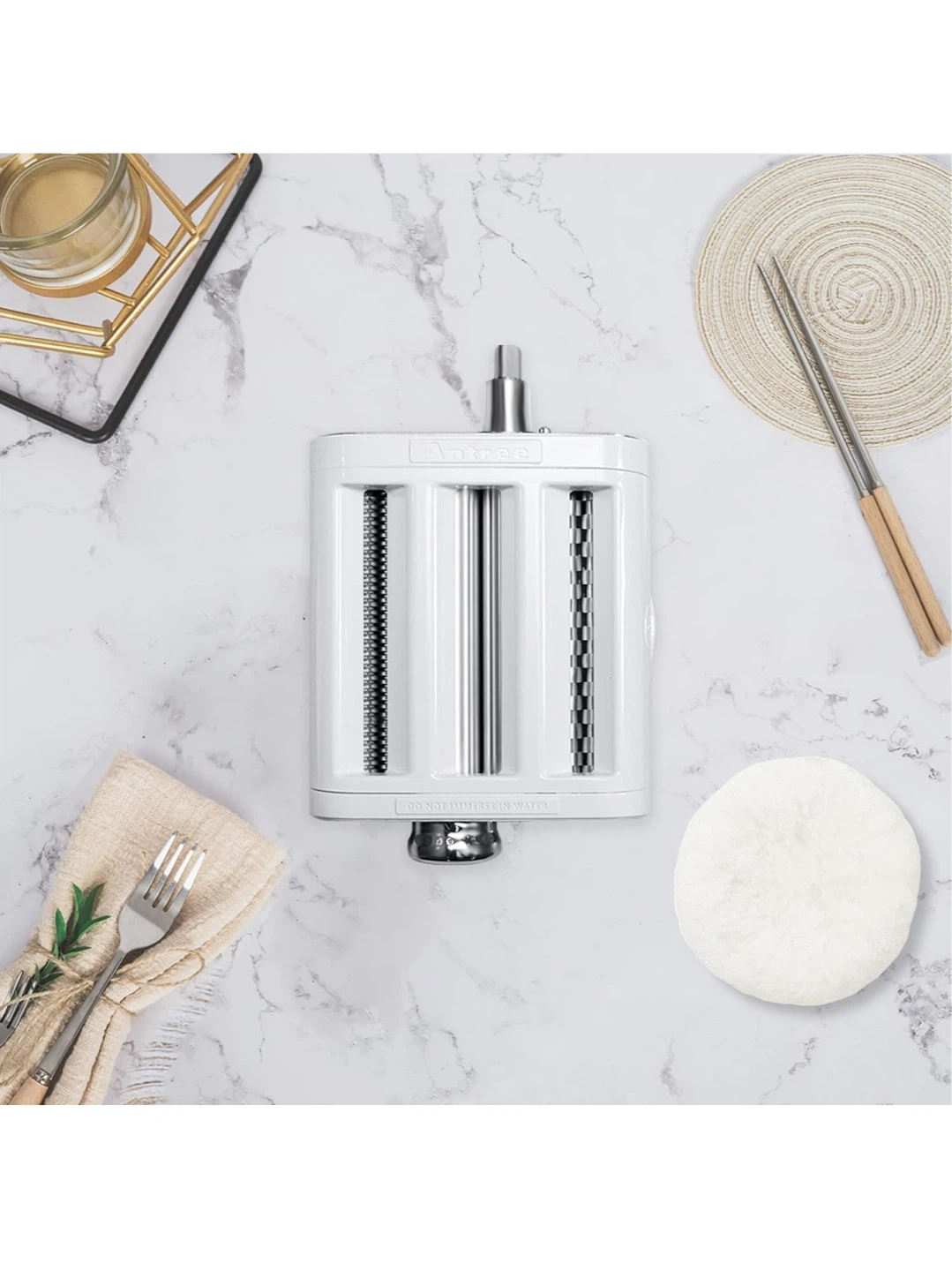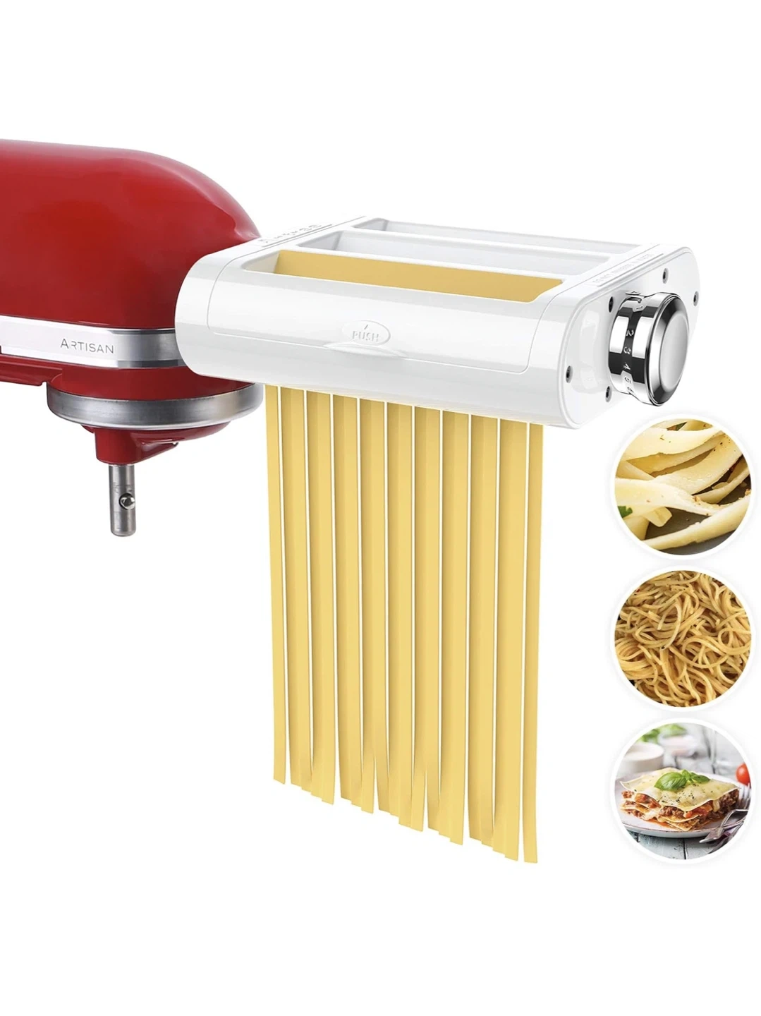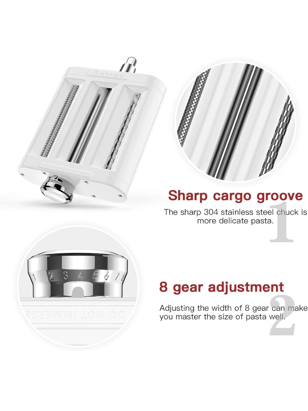 This attachment fits KitchenAid stand mixers to make fresh pasta. It features an 8-gear adjustment for controlling pasta thickness. The sharp 304 stainless steel chuck is designed for delicate pasta.