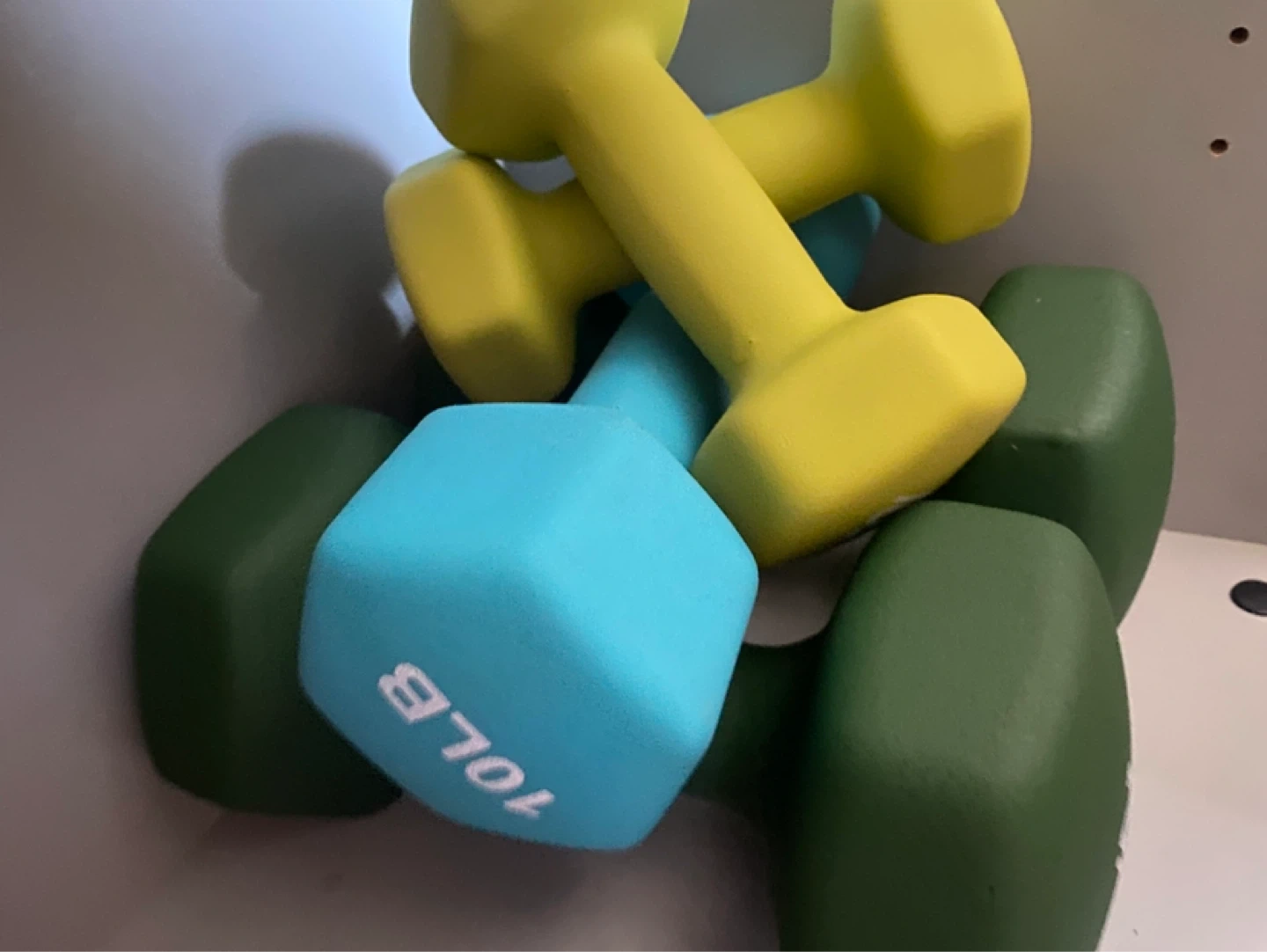 Set of neoprene coated dumbbells includes one pair of 5lb, one 10lb, and one pair of 20lb weights. Different colour coatings for easy identification. Weights come in yellow, teal, and green.