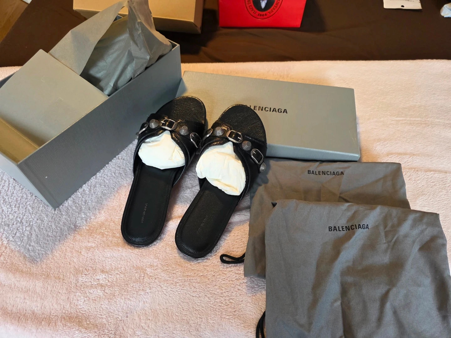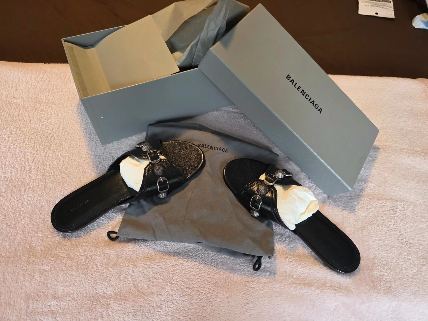 Balenciaga black slide sandals with silver stud detailing. Includes original box and dust bags. Leather material.
