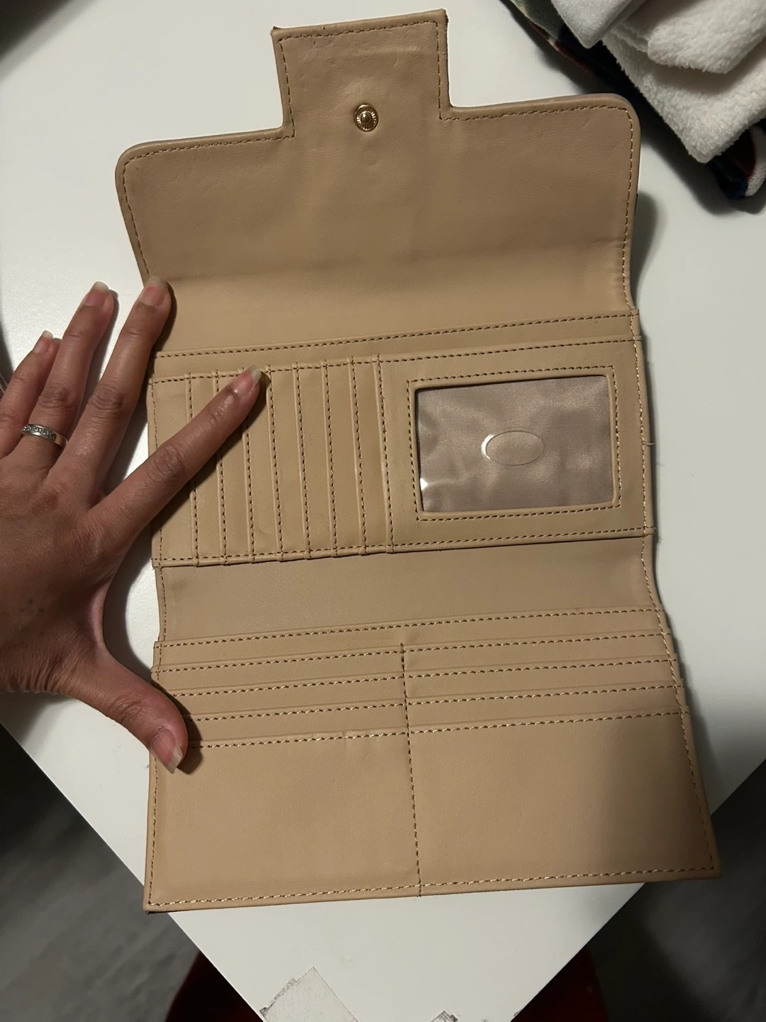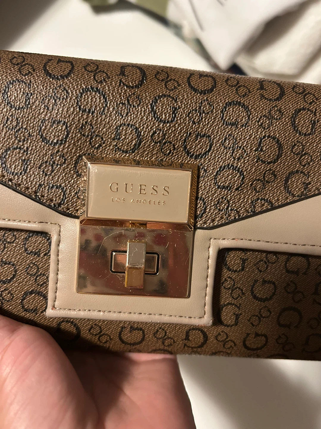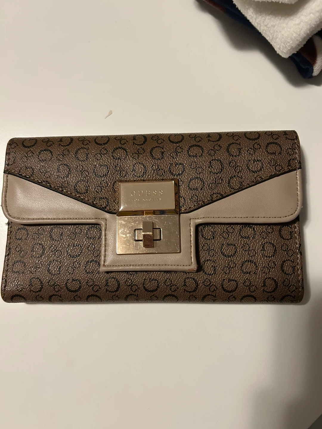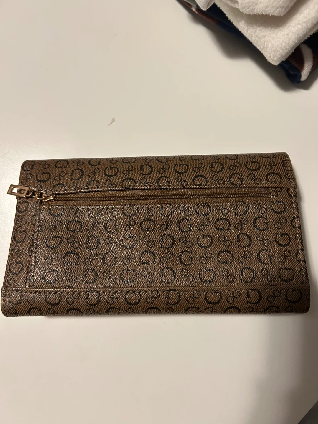 This is a GUESS wallet with a brown signature 'G' logo print. It features multiple card slots and a zippered coin pocket. The interior is beige.