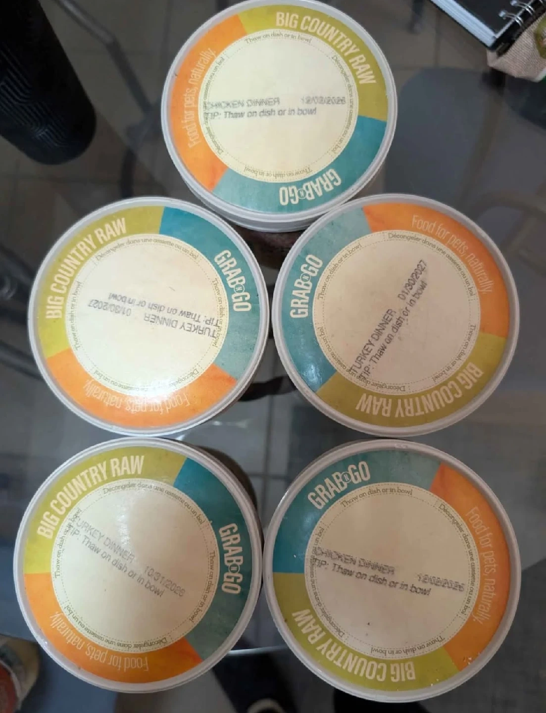 60Selling Big Country Raw Grab & Go pet food. - Chicken Dinner, expiry date 2026 February 12 - Turkey Dinner, expiry date 2027 January 30 Food for pets, naturally! Thaw on dish or in bowl I have five 2lbs tubs of raw food for dogs. balanced meal.