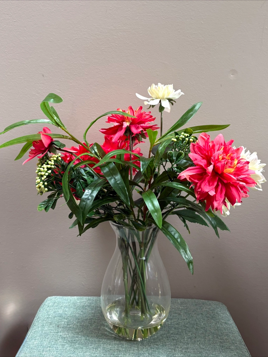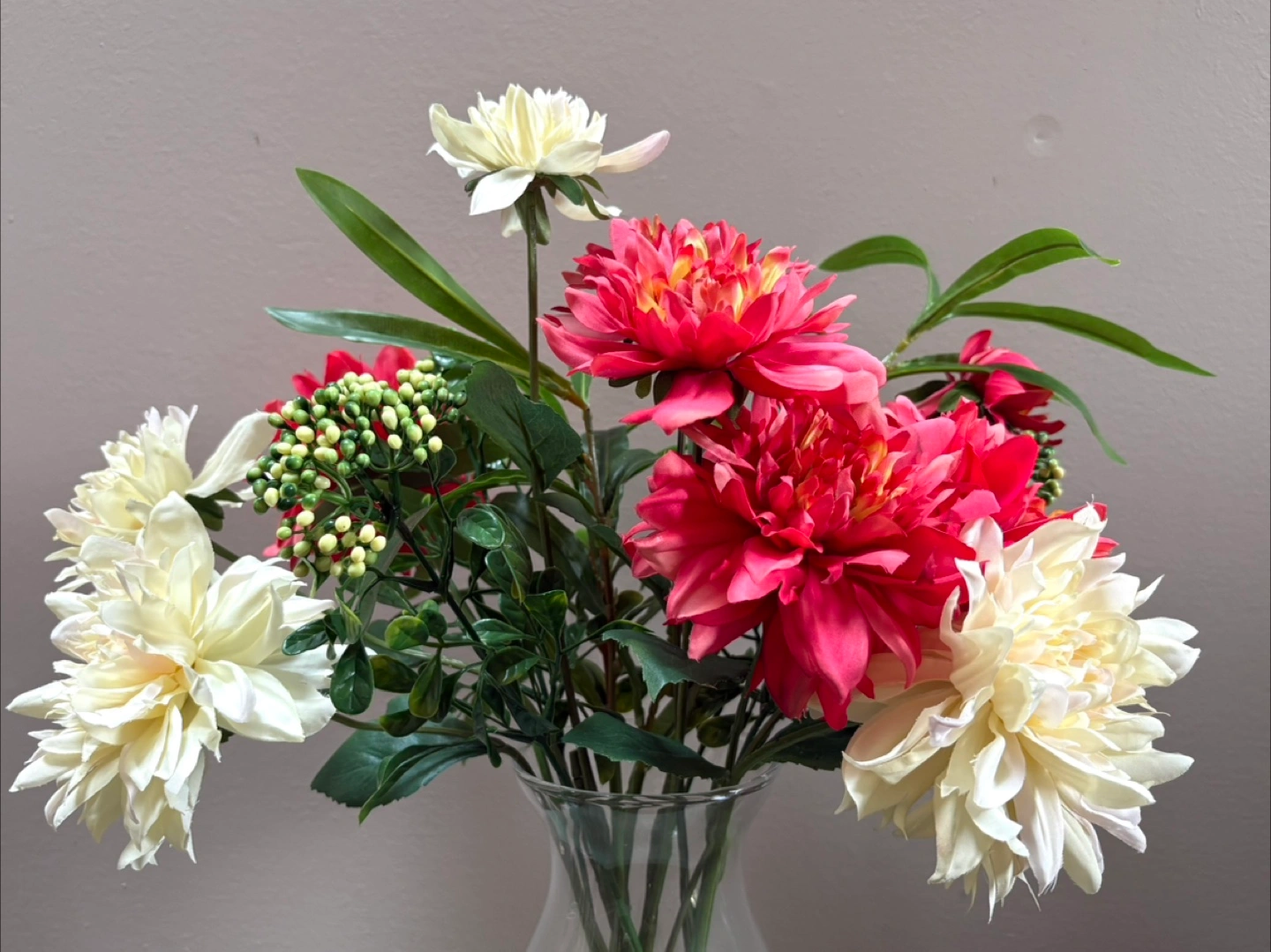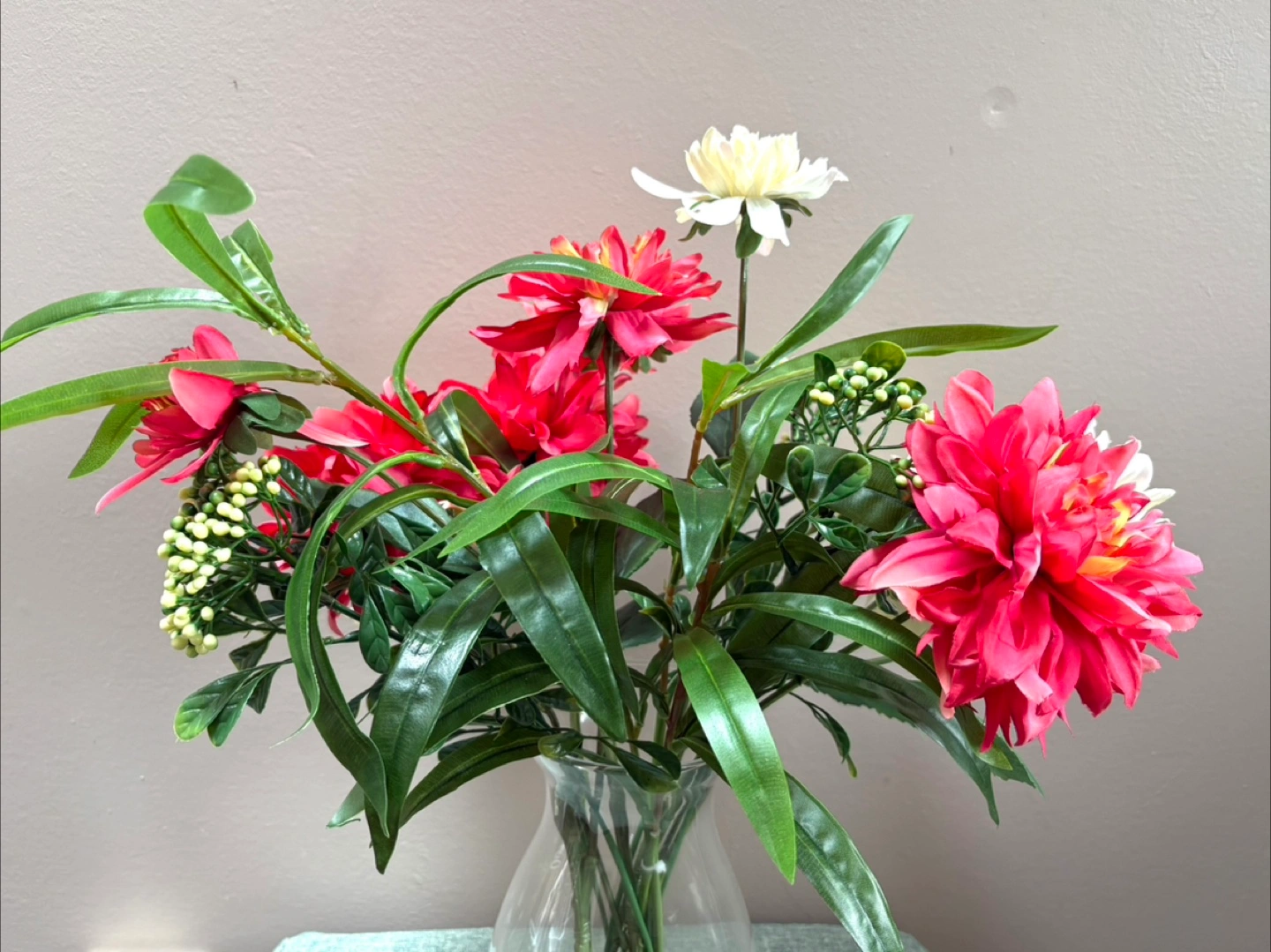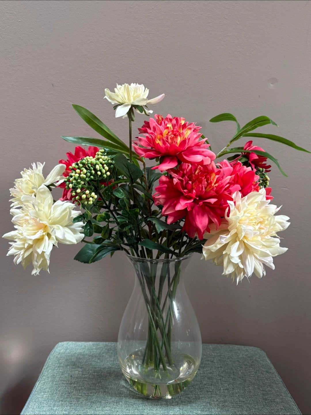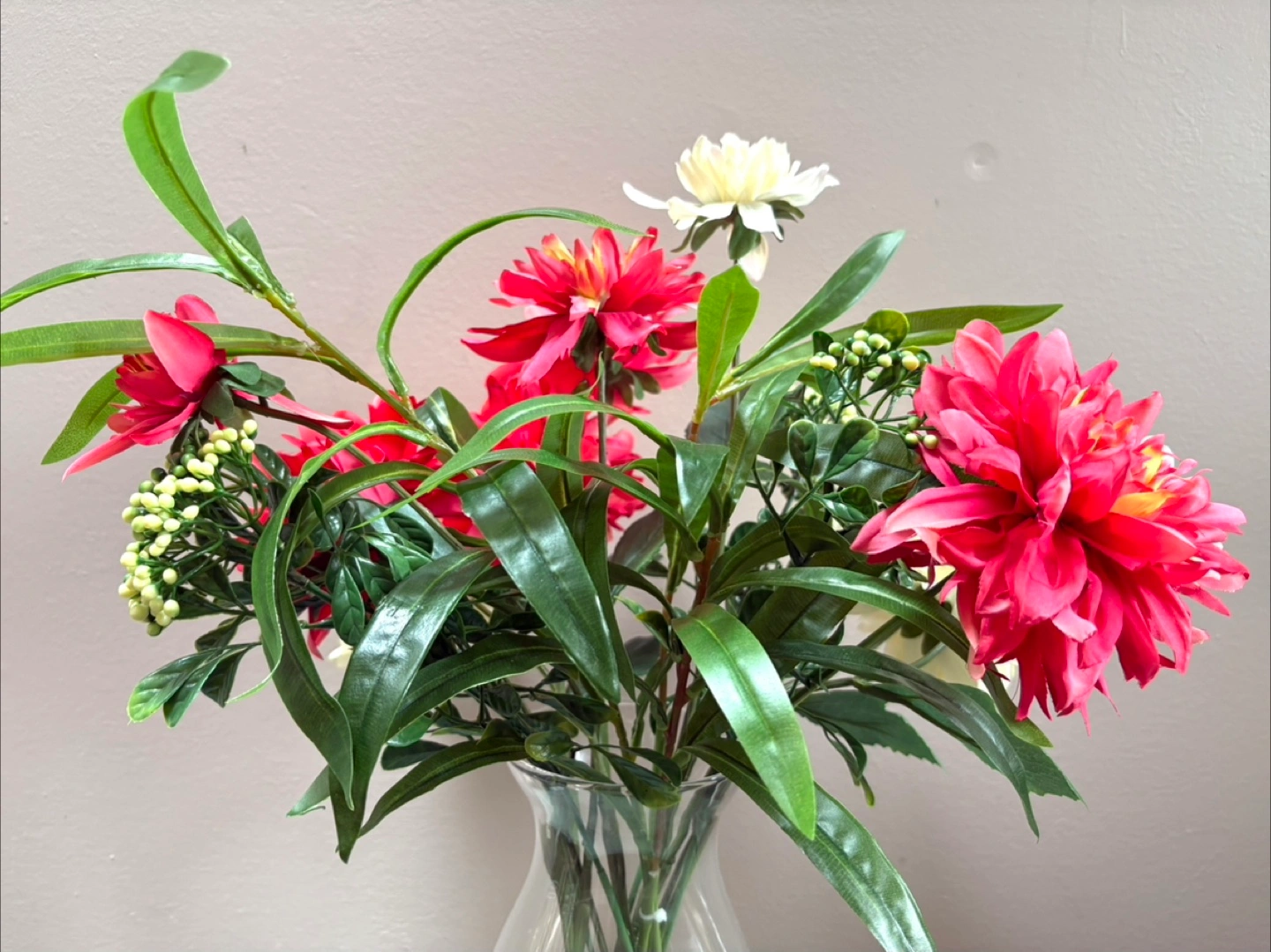 A lovely flower arrangement in a clear glass vase. The flowers are a mix of red and white, adding a touch of elegance to any room. Perfect for brightening up your space! The whole arrangement is 19” high The glass vase is 9” high The top is Approx 17” wide