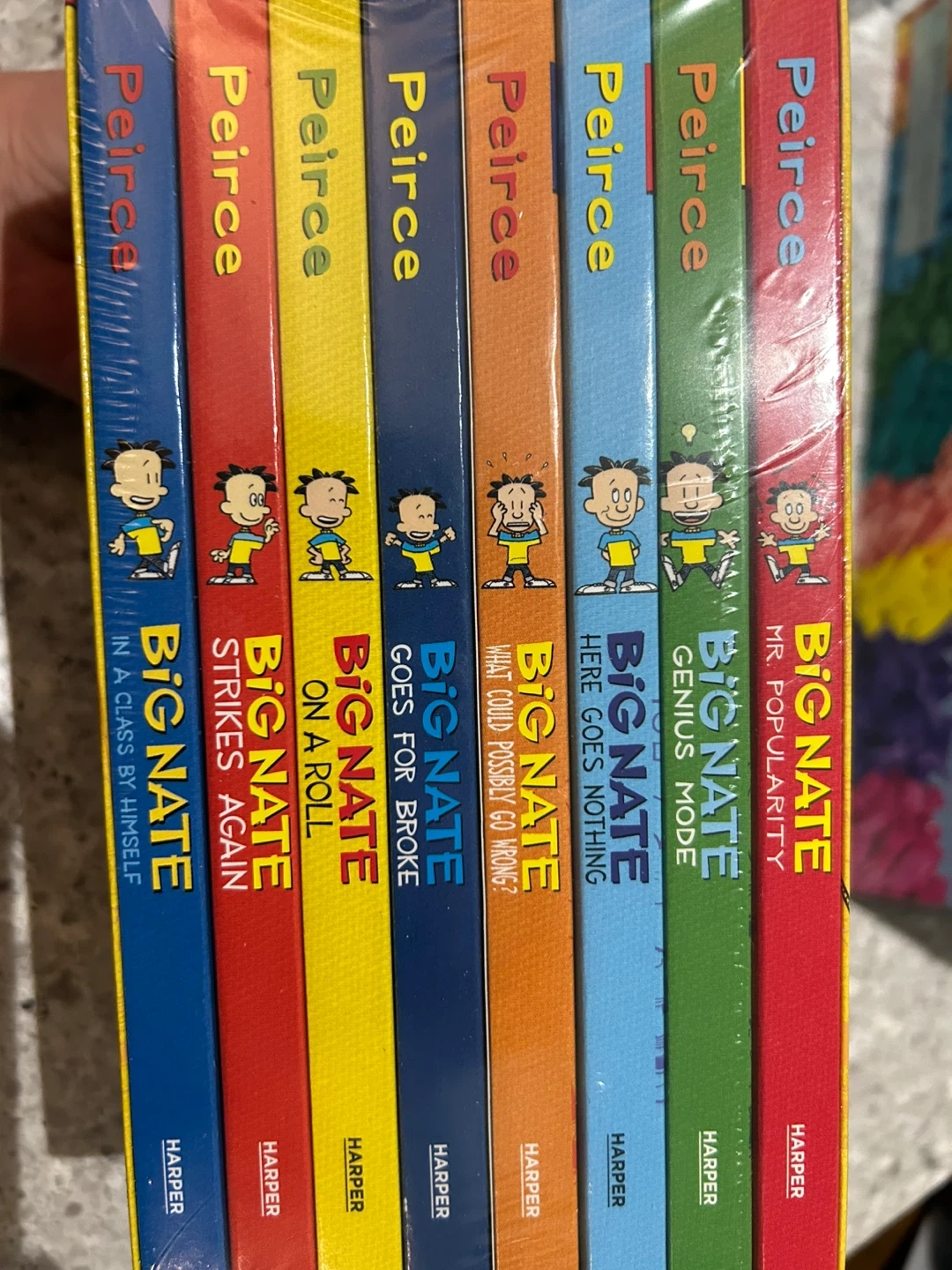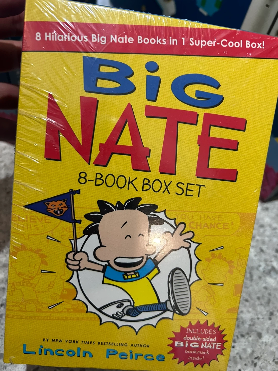 Brand new! Selling a Big Nate 8-Book Box Set by Lincoln Peirce! It's a super-cool box with 8 hilarious Big Nate books. Includes a double-sided Big Nate bookmark inside. Dawes/Danforth (sorry no porch pickup)