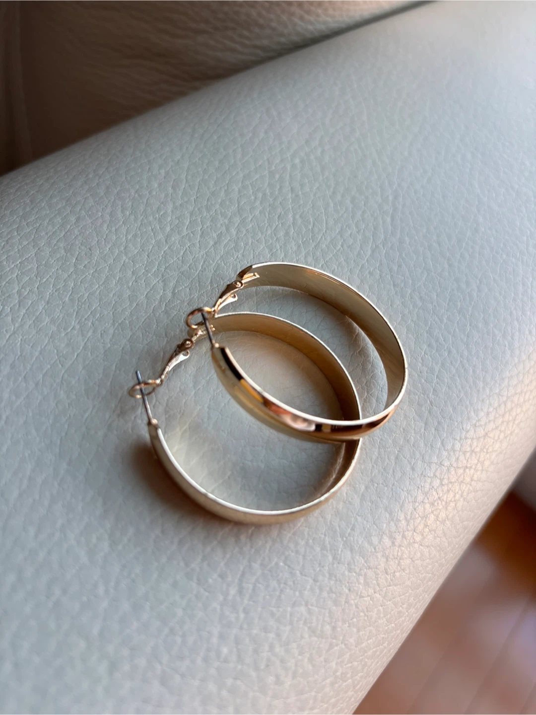 Classic gold (not real) new hoop earrings. These hoops offer a subtle shimmer and are lightweight for comfortable wear. They're perfect for adding a touch of elegance to any outfit. They are 1 1/2 inches high in diameter. Gift box included.