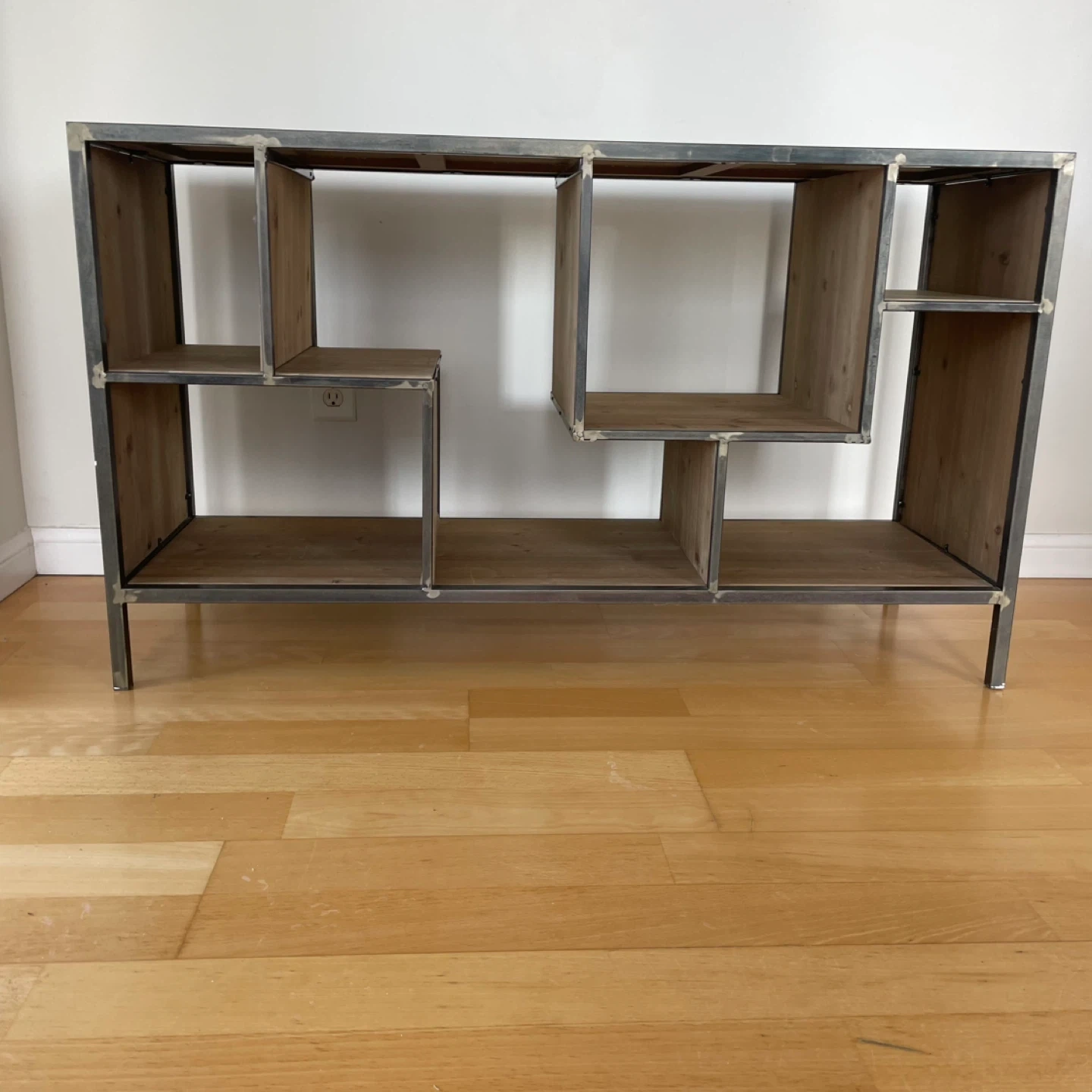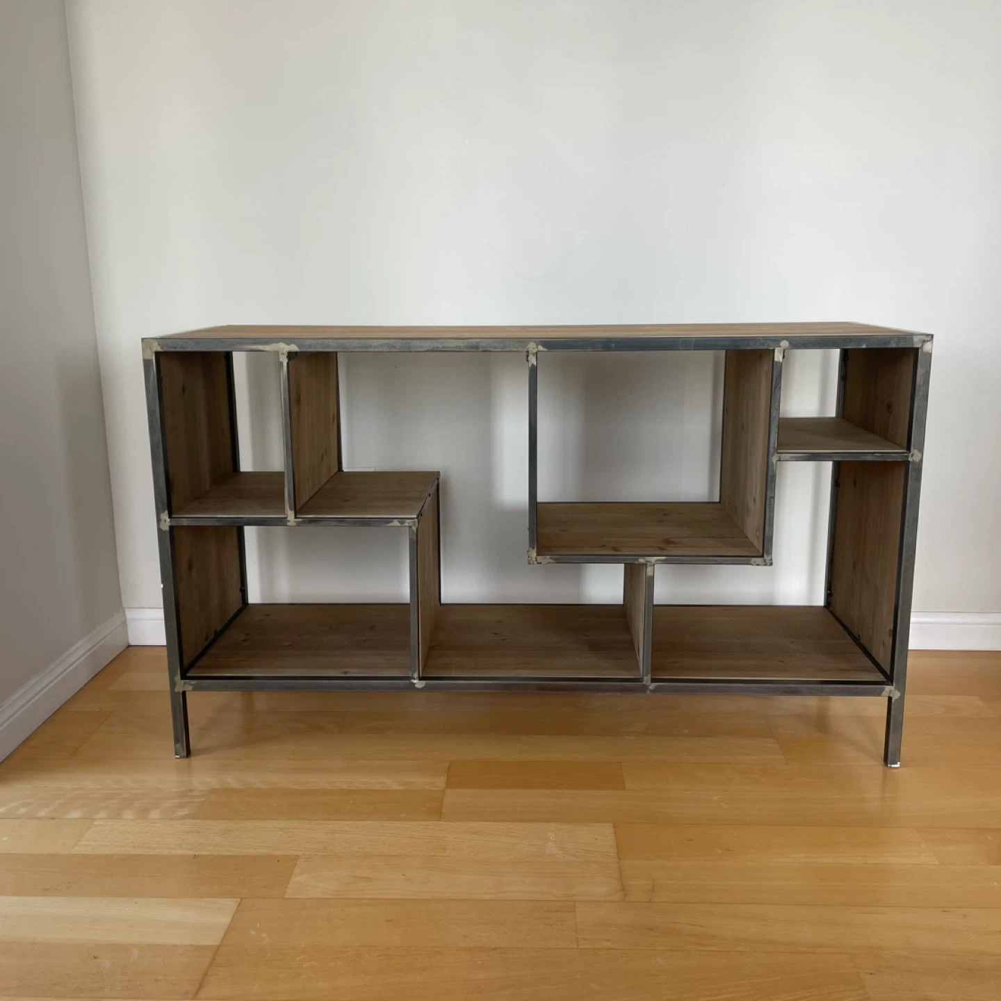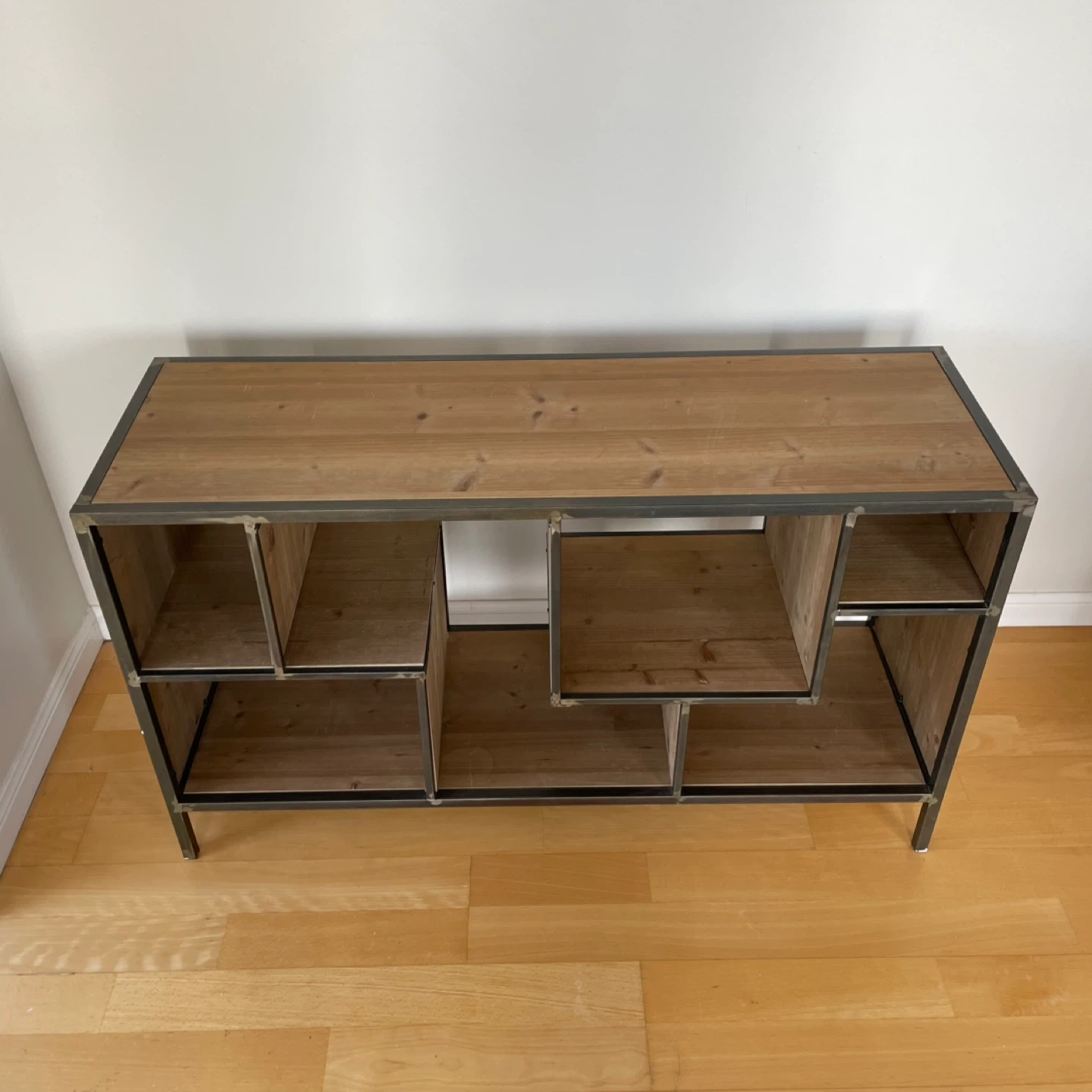Open shelf sideboard console table unit shelves cupboard featuring wood shelving and a metal frame. It's designed with staggered compartments for a unique look. This piece offers ample storage and display space. Perfect condition. 120 length x 40 width x 70 height (cm)