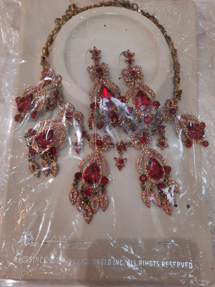 10Beautiful red and gold tone necklace and earrings set from the Bijoux World Carol Collection. This set is still in its original packaging and has never been worn. Perfect for adding a touch of sparkle to any outfit!