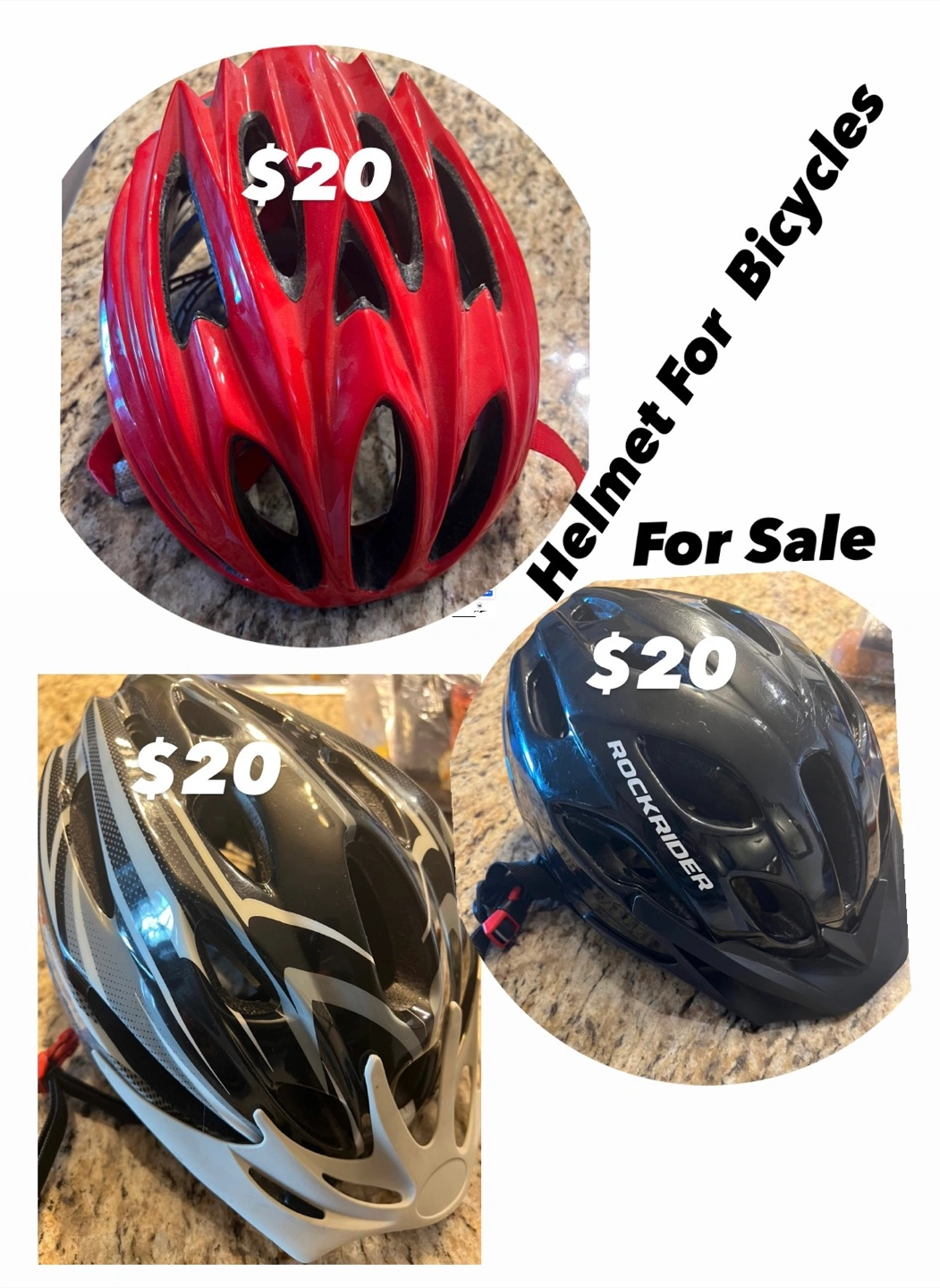 Selling bike helmets for $20 each. One is red, and another is a Rockrider brand, black helmet.