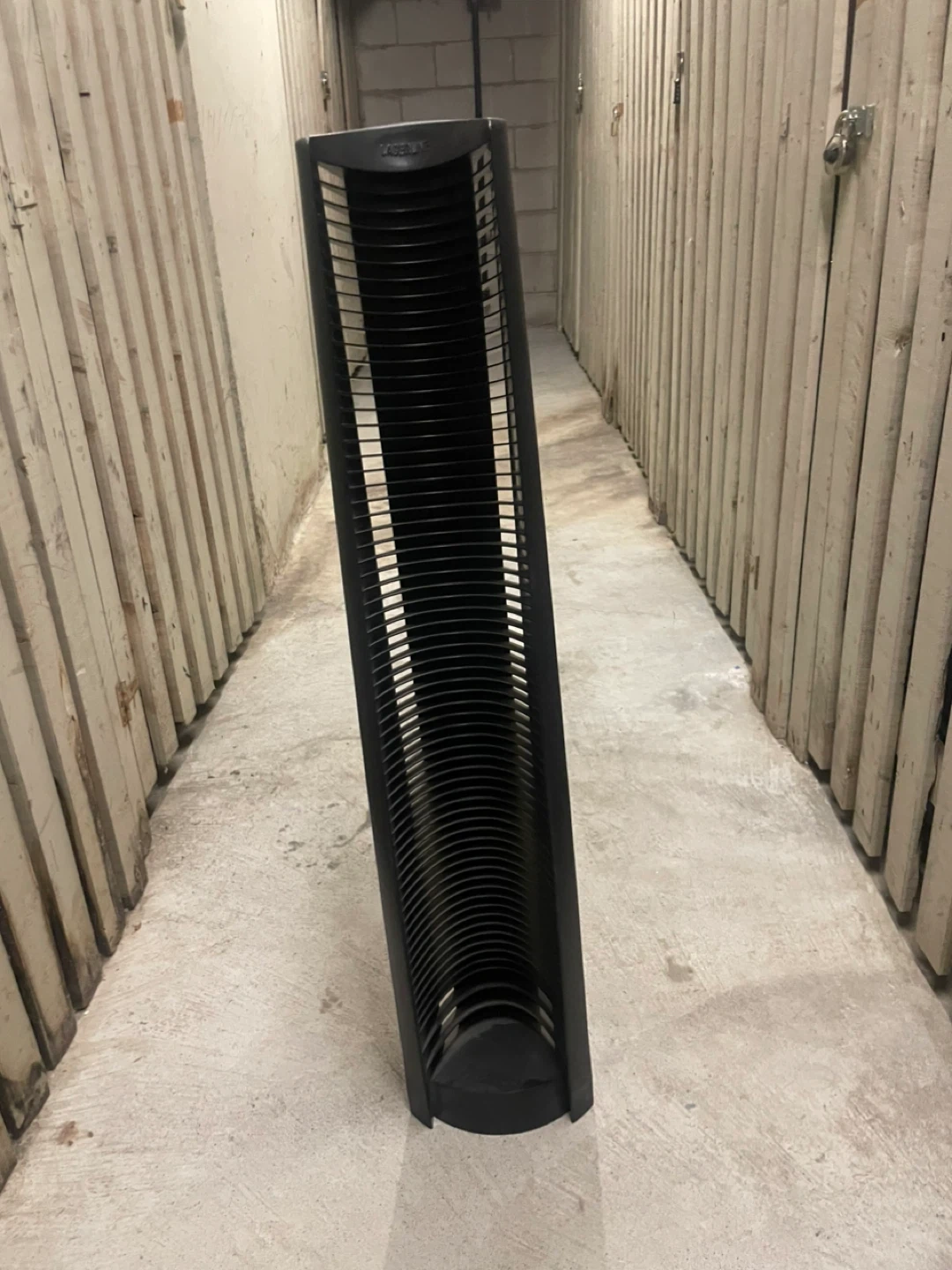 This black plastic CD storage tower holds many discs. It's designed to stand upright for easy access to your music collection. Approximately 17 inches tall.