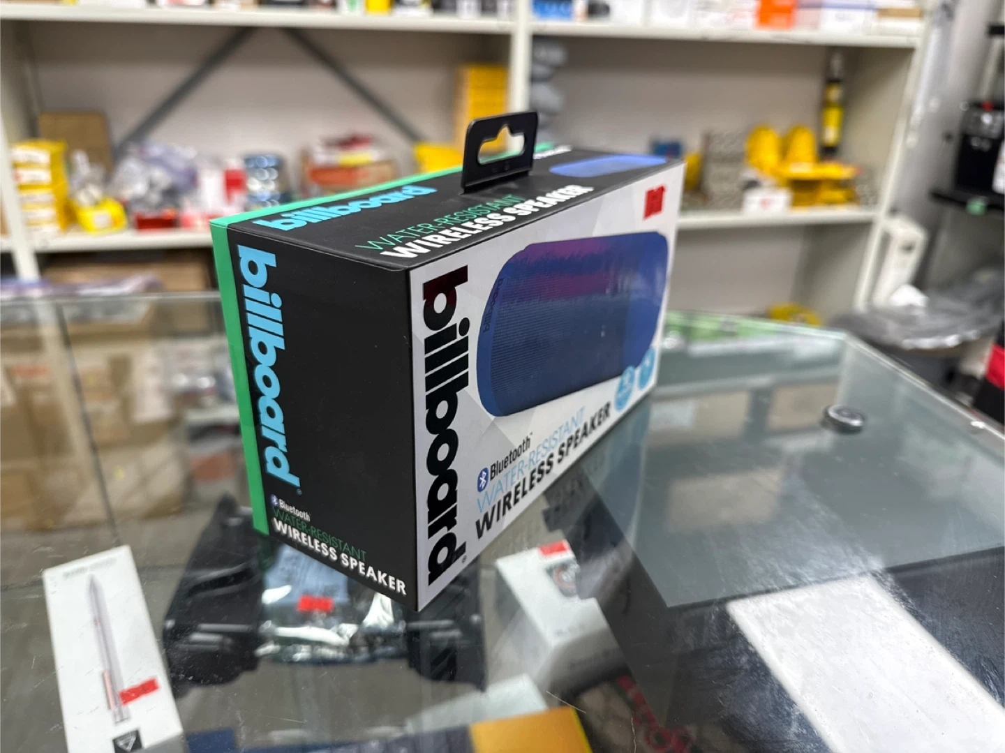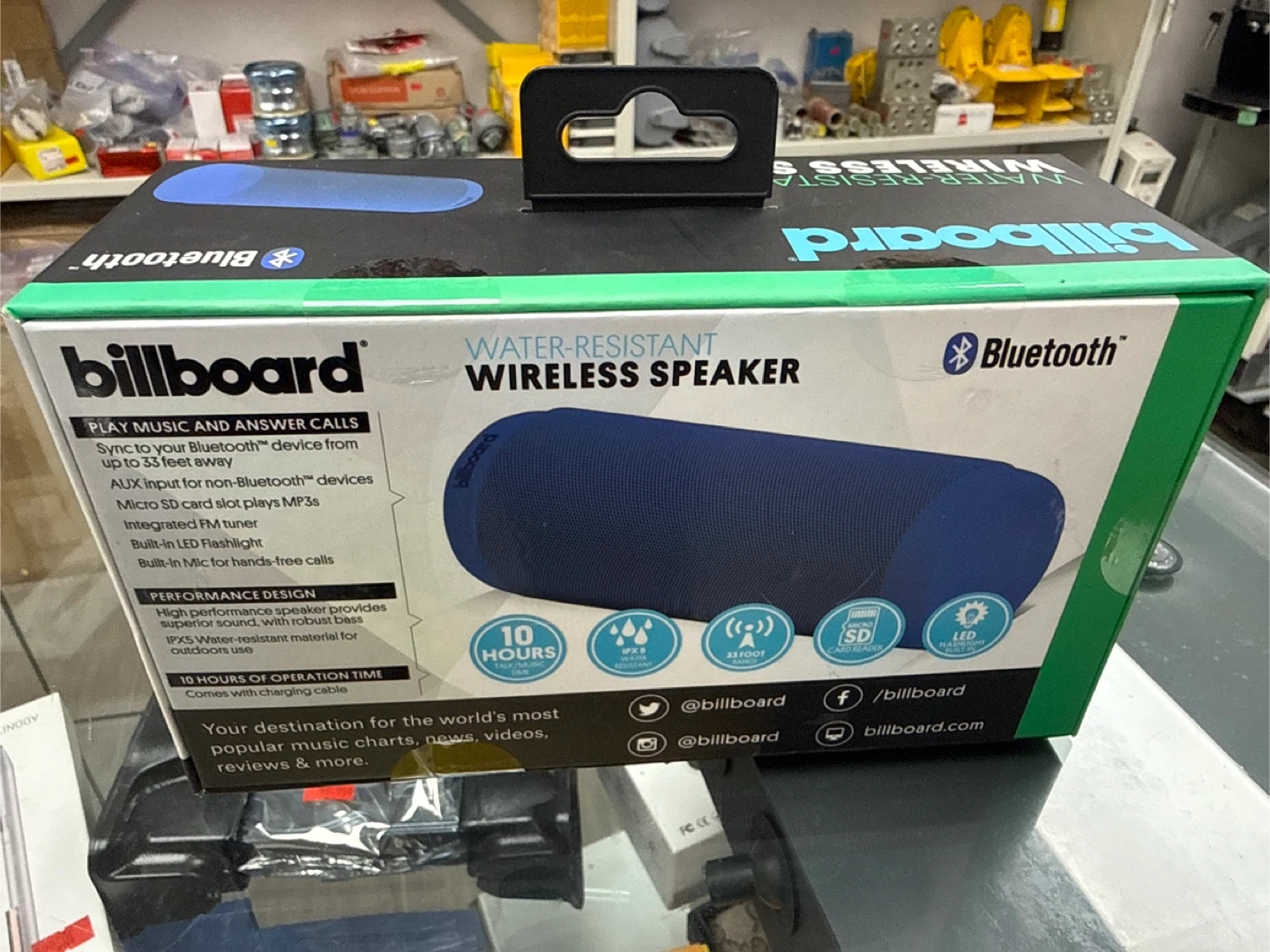 Selling a brand new Billboard water-resistant wireless speaker! It comes in its original box. Key features: - Plays music and answers calls - Syncs to your Bluetooth device from up to 33 feet away - AUX input for non-Bluetooth devices - Micro SD card slot plays MP3s - Integrated FM tuner - Built-in LED flashlight - Built-in Mic for hands-free calls - High-performance speaker provides superior sound with robust bass - IPX5 Water-resistant material - Up to 10 hours of operation time with charging cable
