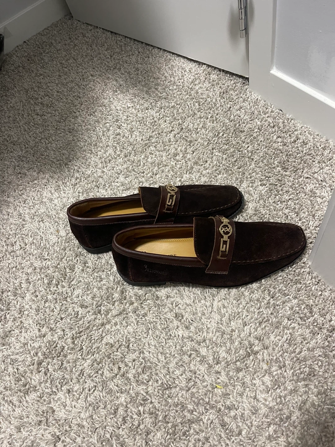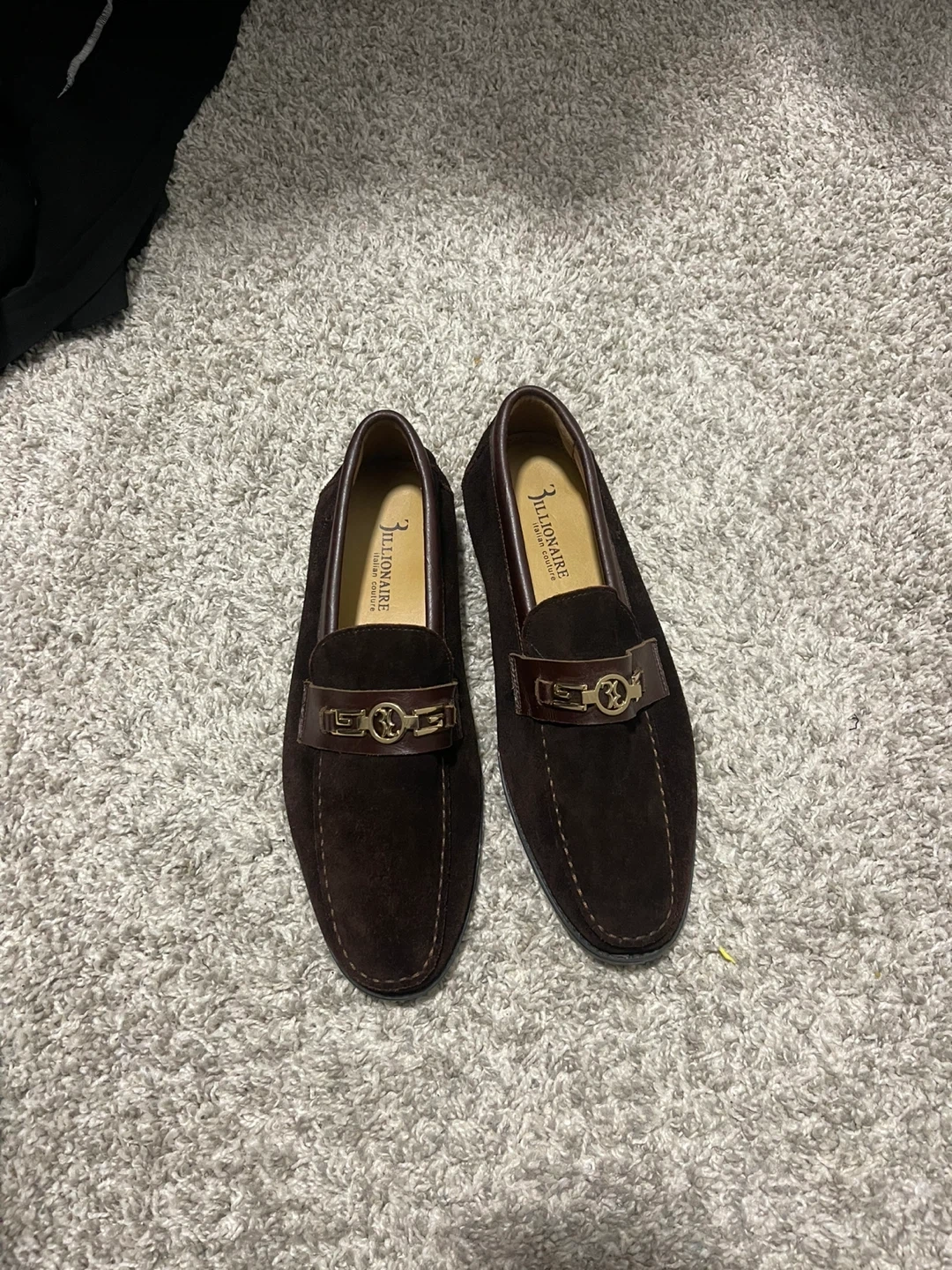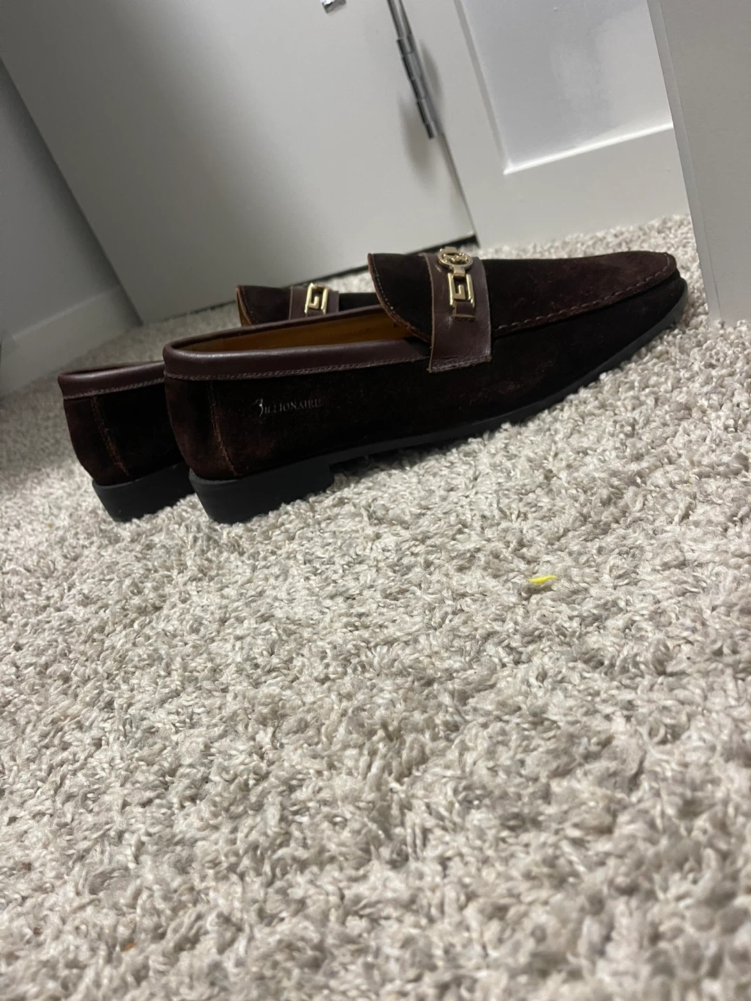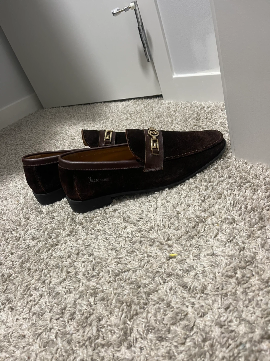 Stylish Billionaire loafers in a rich brown suede. These shoes feature a unique gold-tone accent on the upper. Perfect for adding a touch of luxury to your everyday style!