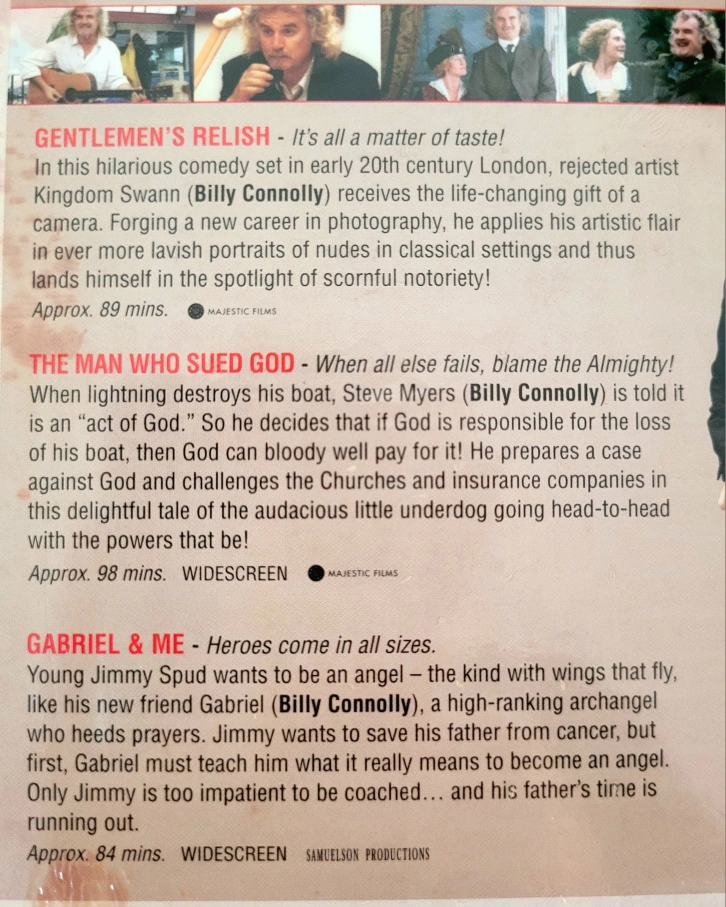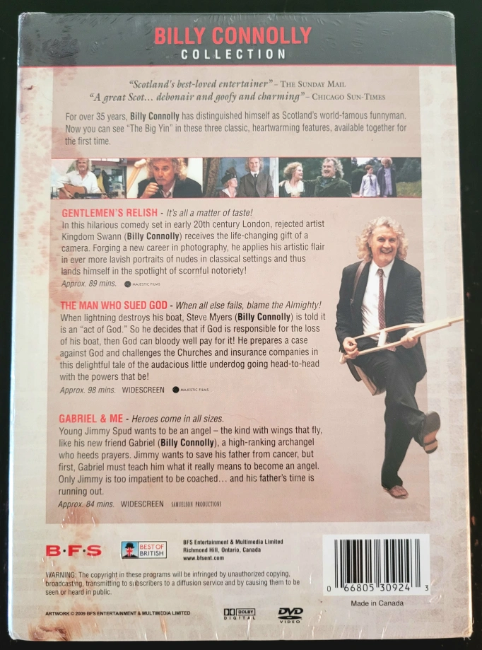 10This 3 DVD disc set of some of Billy Connolly's most classic movies is brand new and still in the packaging. The titles included are, "Gentlemen's Relish", "The Man Who Sued God", and "Gabriel & Me". This would make an excellent gift for the Billy Connolly fan in your life!