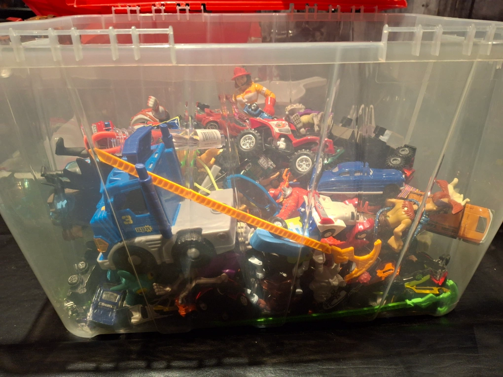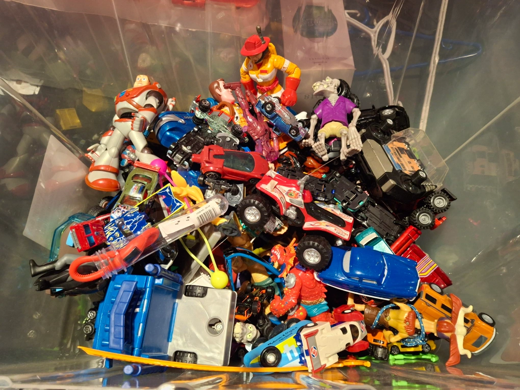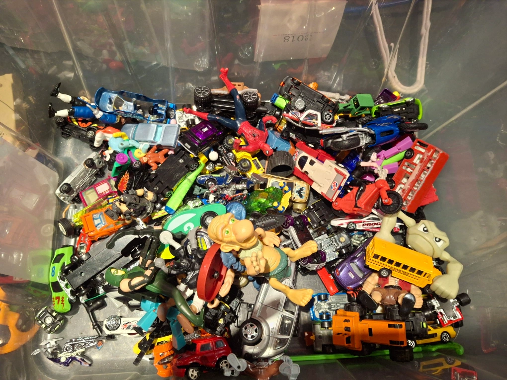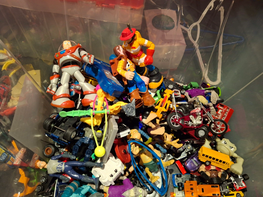 Bin full of toys. Small cars, motorcycles, buzz, figures ect.. Some maybe in great condition.. Some might be missing pieces. Pickup Thornton and Rossland in Oshawa. Bin included
