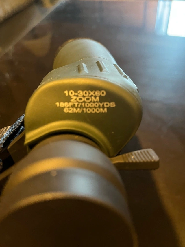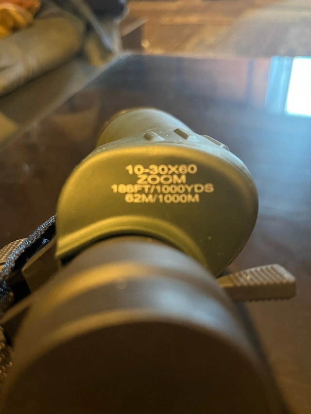 12Binoculars 10-30x60 Zoom Great for hunting fishing or bird watching Lense protectors Anti fog technology Comes with lanyard and carrying case No holds cash only Open to trades Contact Colin at 403-803-6two23 Check out my other adds