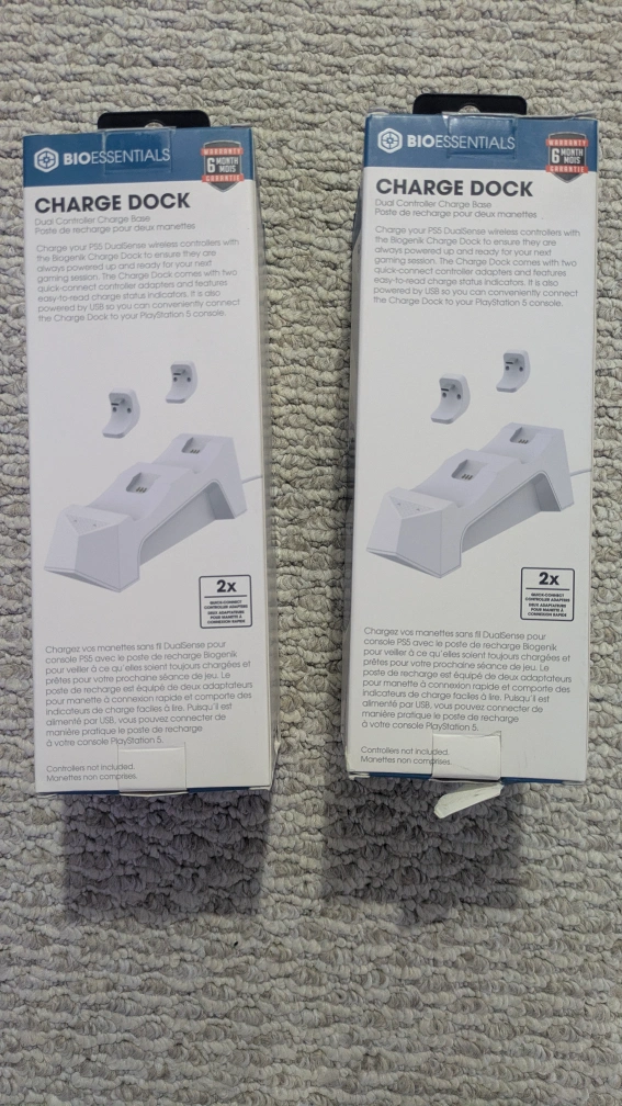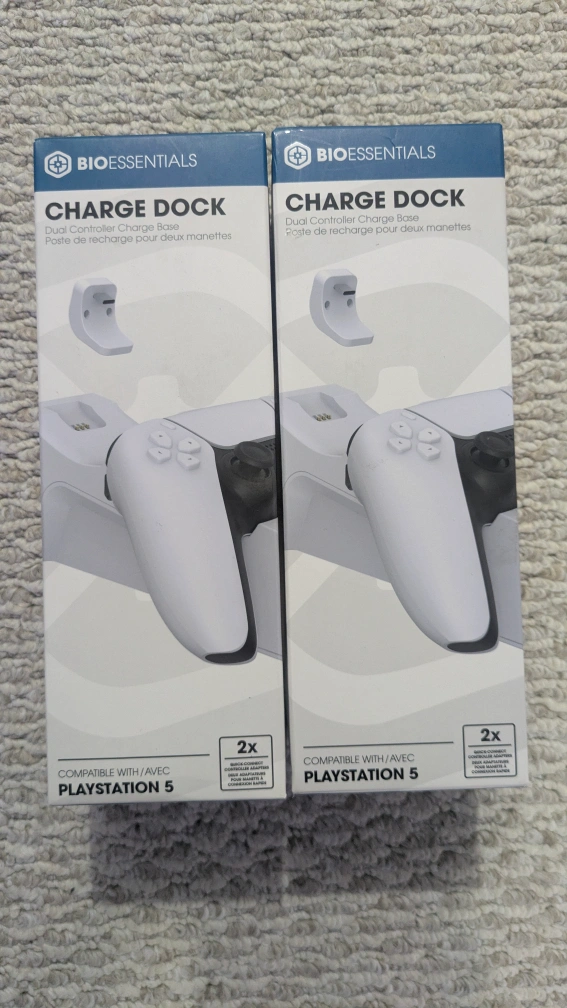 31I have two brand new BioEssentials Dual Controller Charge Docks for the Playstation 5. $10 for one, each charges two controllers They're still in their boxes and ready to go! Charge your PS5 DualSense wireless controllers with the BioGenik Charge Dock to ensure they are always powered up and ready for your next gaming session. The Charge Dock comes with two quick-connect controller adapters and features easy-to-read charge status indicators. It is also powered by USB so you can conveniently connect the Charge Dock to your Playstation 5 console