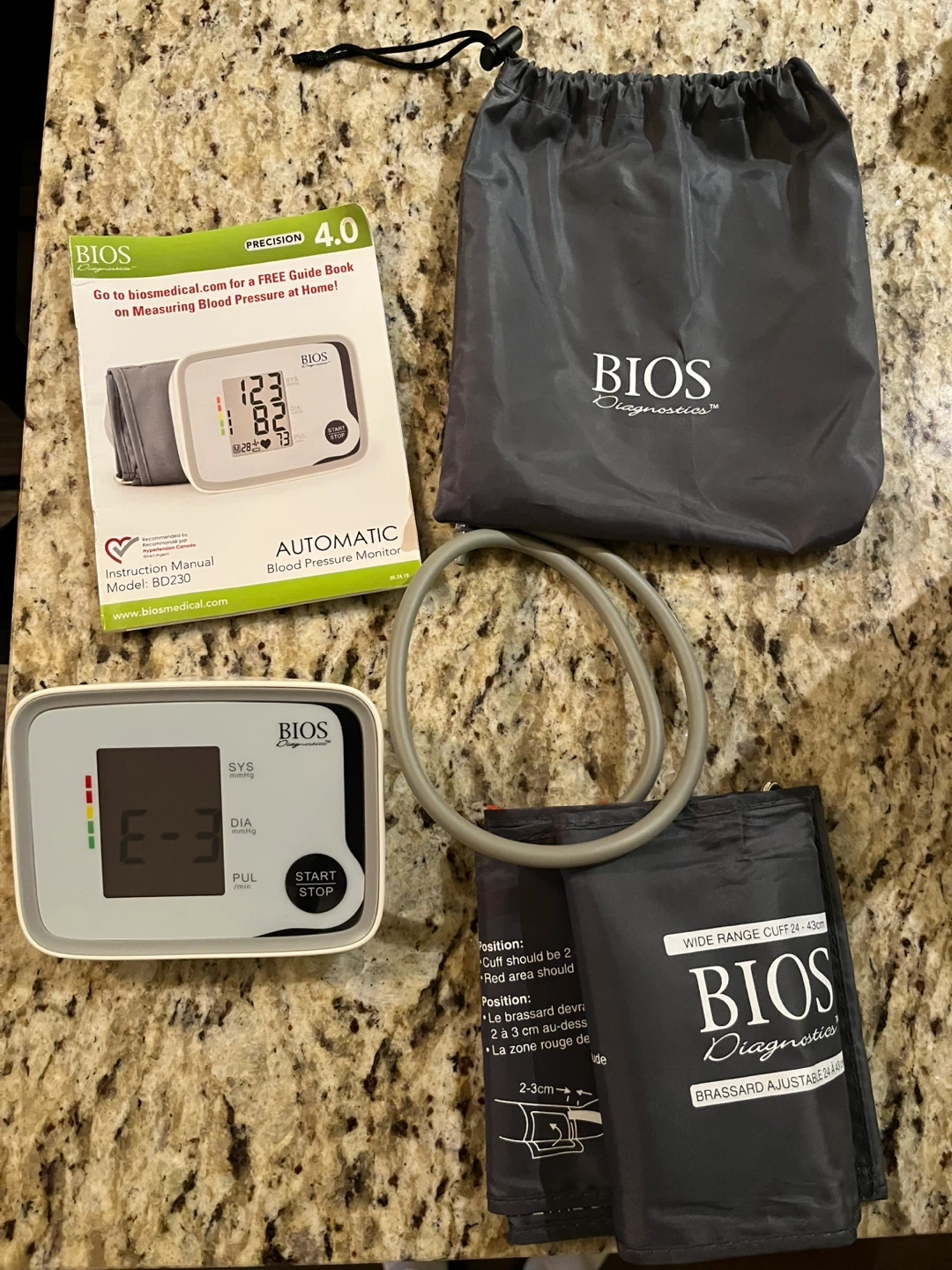 Selling a BIOS Diagnostics automatic blood pressure monitor, model BD230. It comes with the wide range cuff (24-43cm), instruction manual, and a handy carrying bag. Great for monitoring your blood pressure at home!