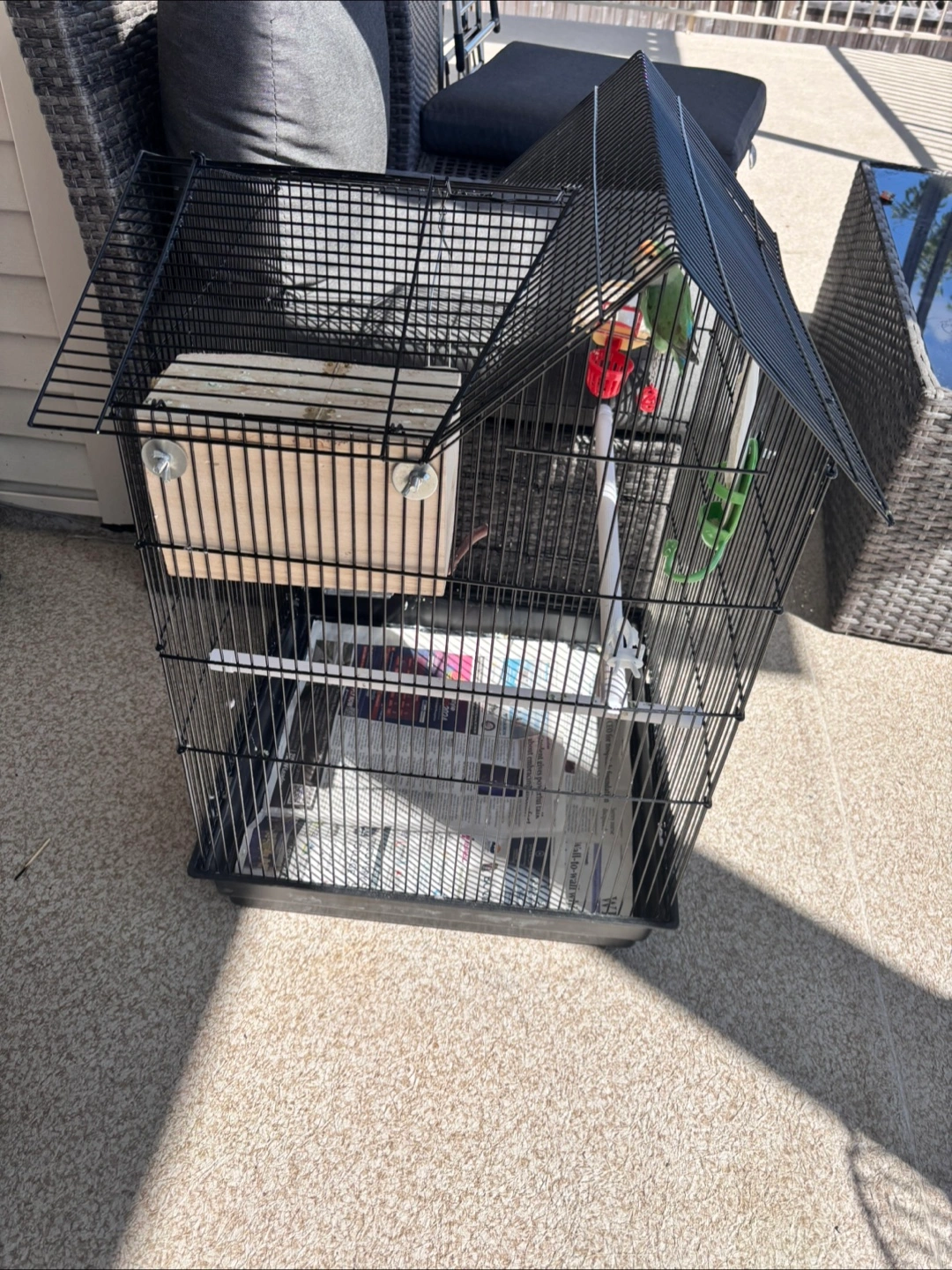 Selling a black bird cage. It's in good condition and ready for a new feathered friend! Includes perches and some toys to keep your bird happy and entertained.