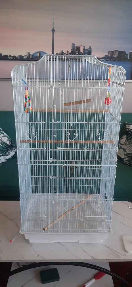 Selling a bird cage in great condition! It's white metal and has a good amount of space for your feathered friend. It comes with a few perches and a feeding container. The cage also has a removable tray for easy cleaning Measurements approximately H 37" W 17.5 D 13