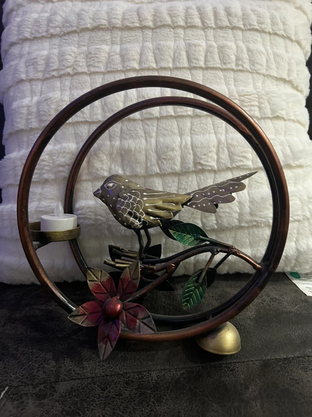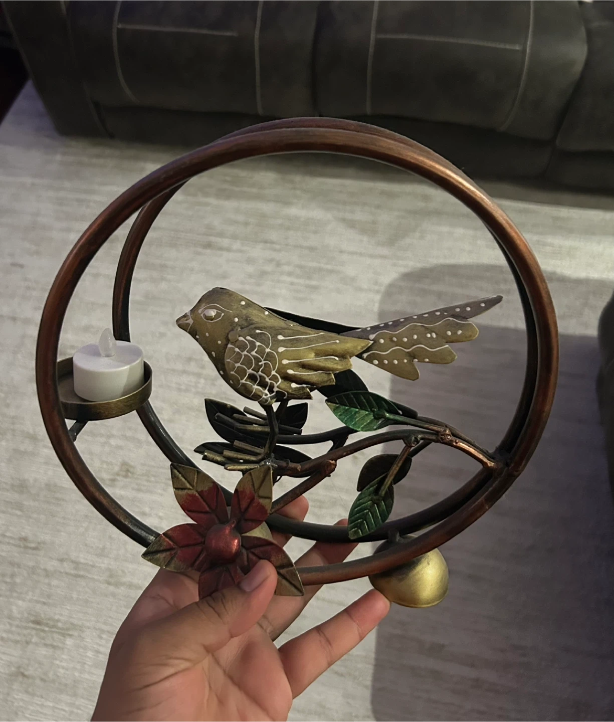 Unique metal candle holder featuring a bird perched on a floral branch inside a circular frame Perfect for adding a touch of nature-inspired charm to any room