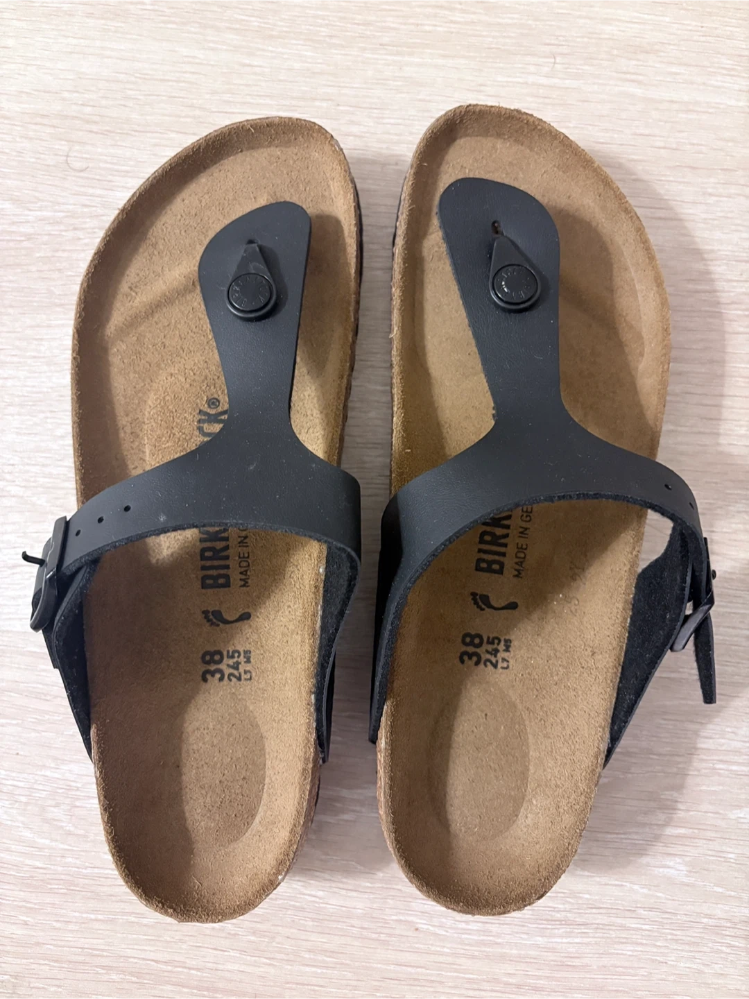 10Selling a pair of Birkenstock Gizeh BF sandals in black. They are size 38. The original price was $134.99.
