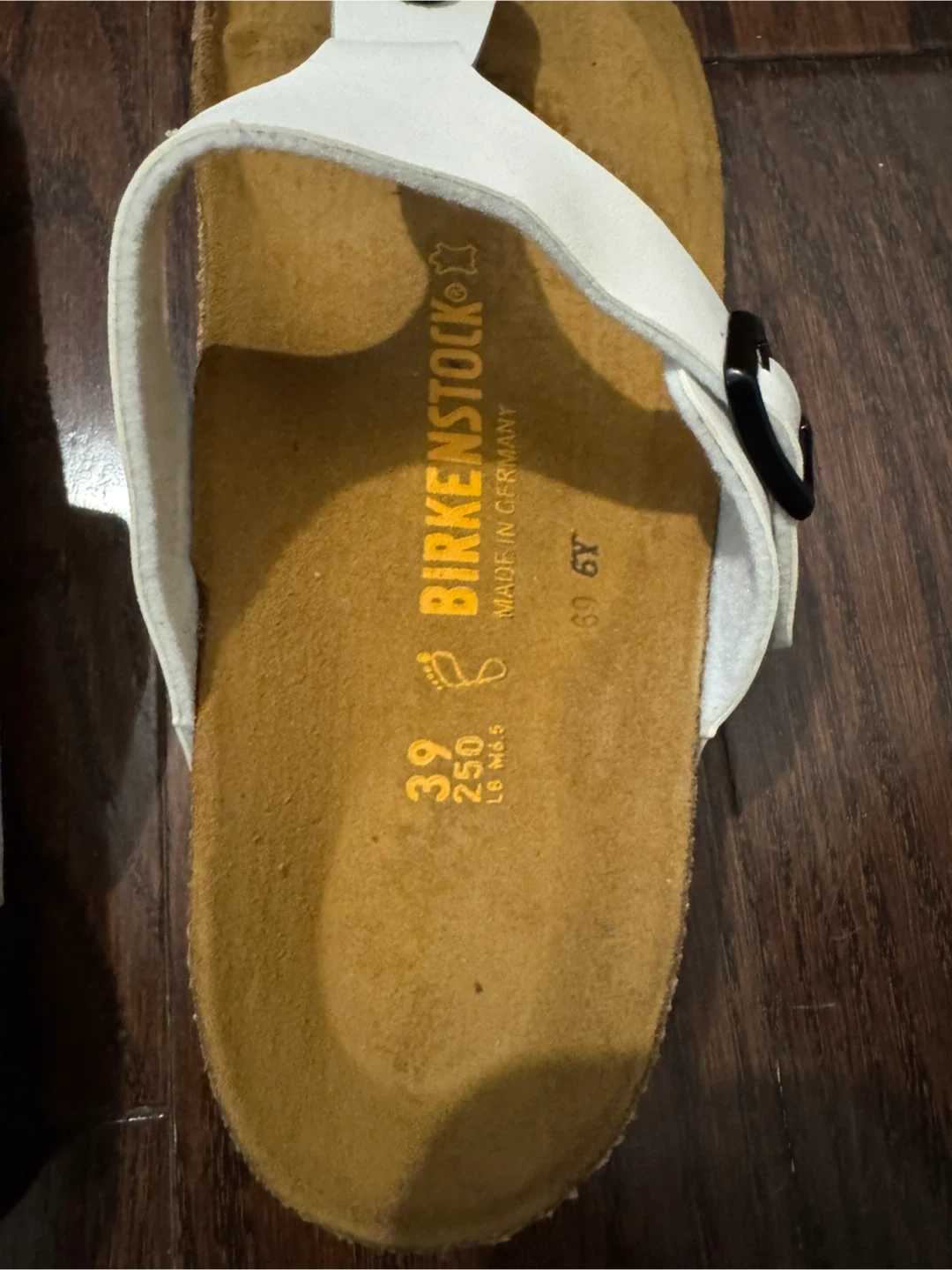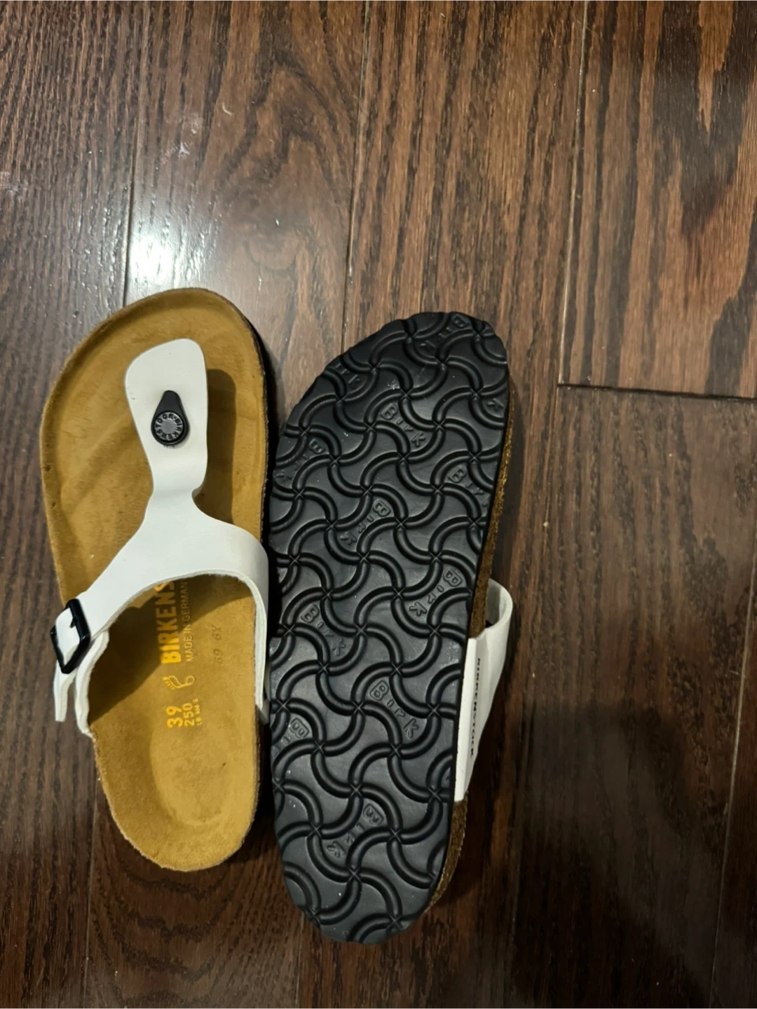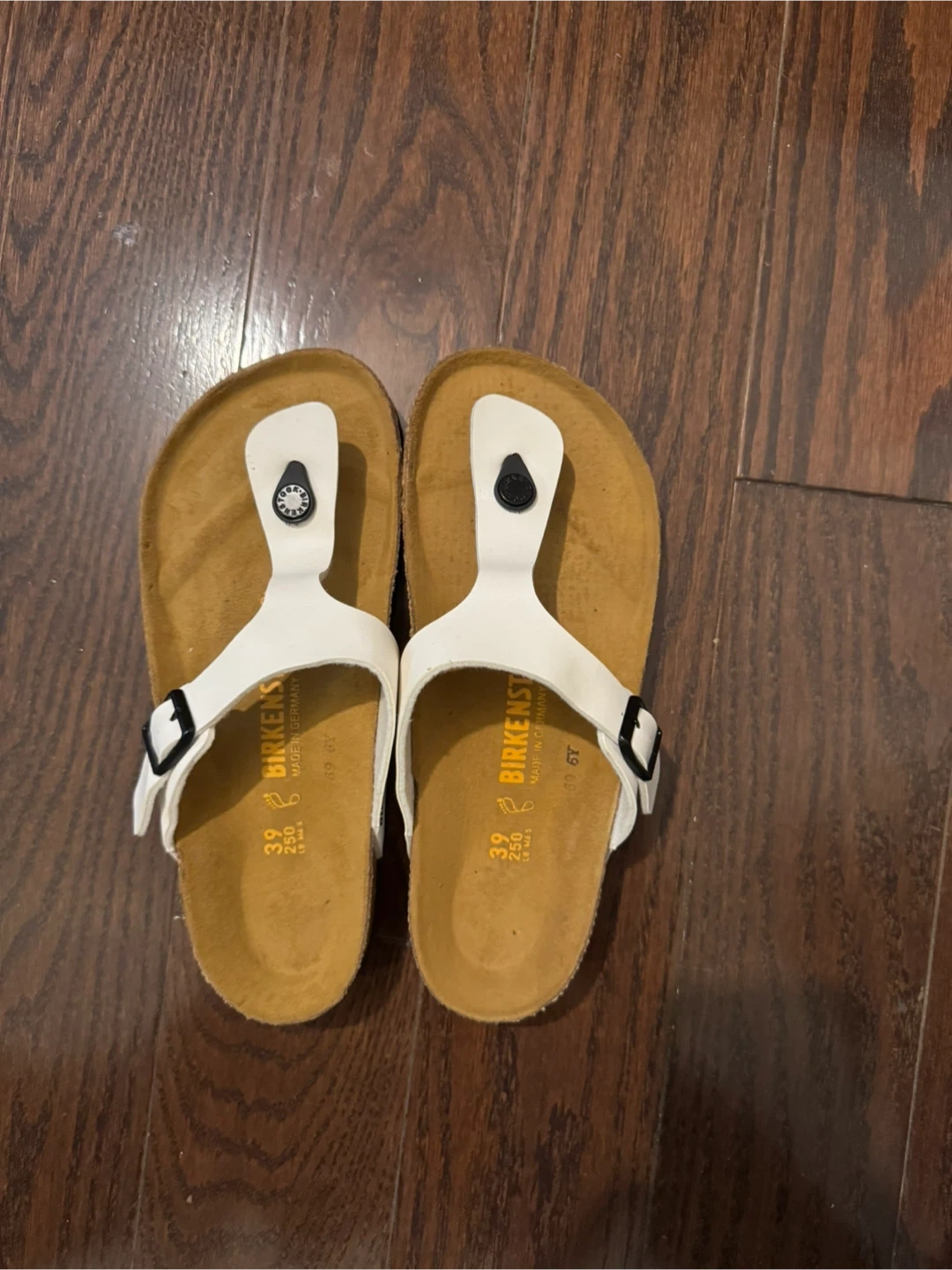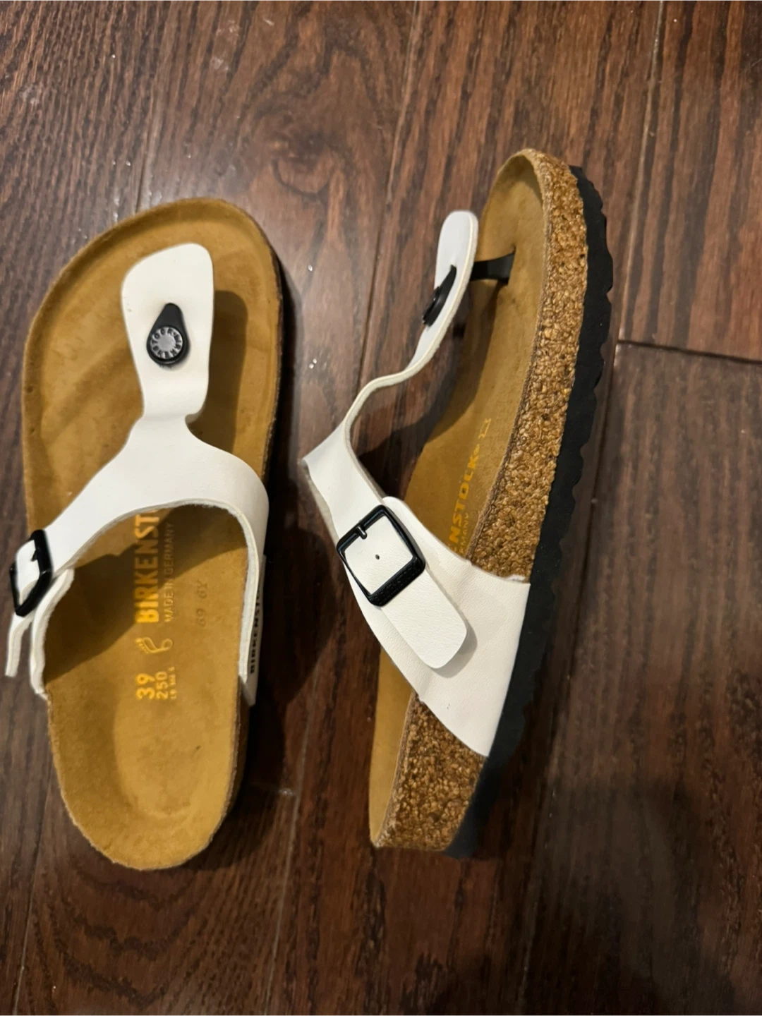 10Selling a pair of Birkenstock Gizeh sandals in white! They are a European size 39, which is equivalent to a US size 8. These sandals are super comfy and great for everyday wear. They have a classic design and are new