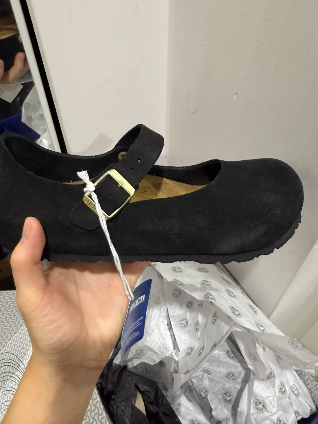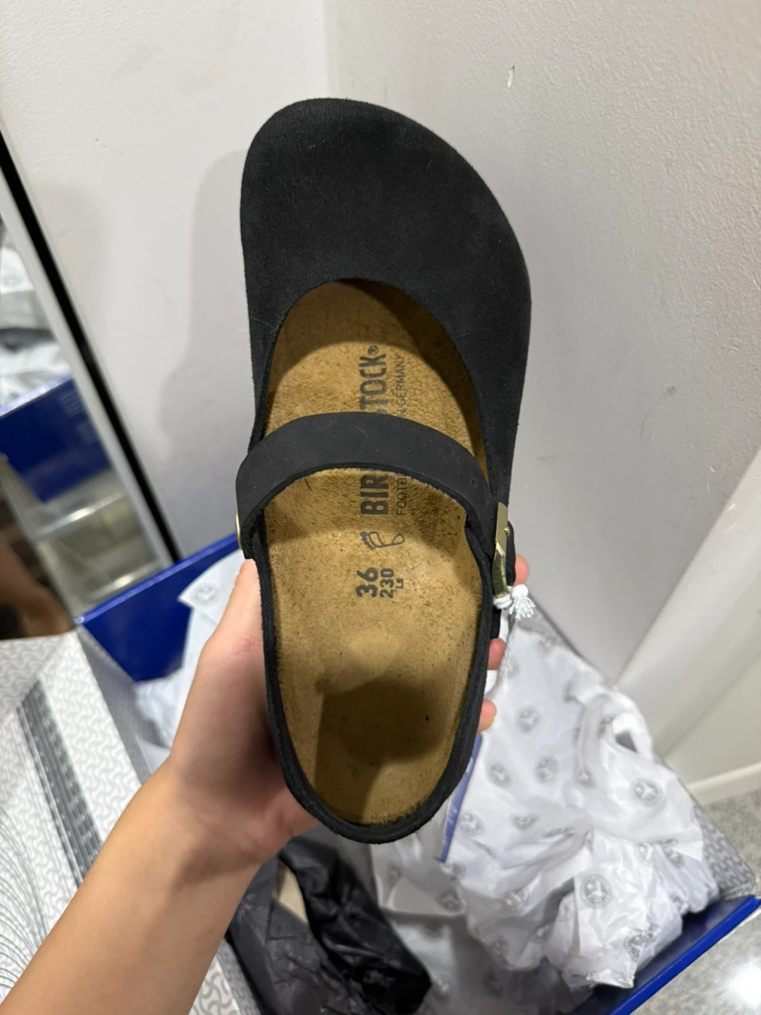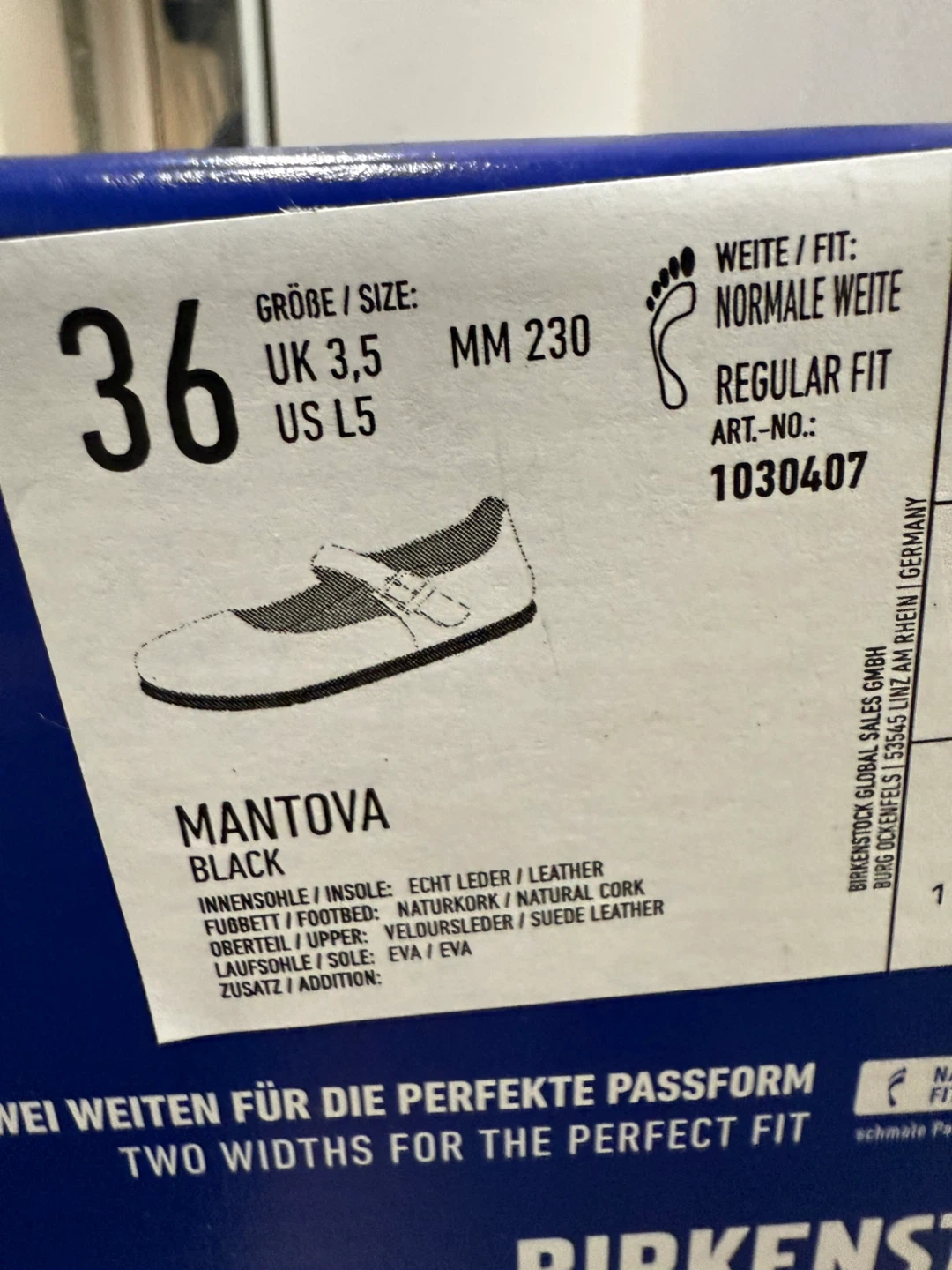 10Selling a pair of Birkenstock Mantova shoes in black suede! They are a US size L5, which is equivalent to an EU size 36. These shoes feature a natural cork footbed and a suede leather upper. Originally bought for $180. Comes with the original box