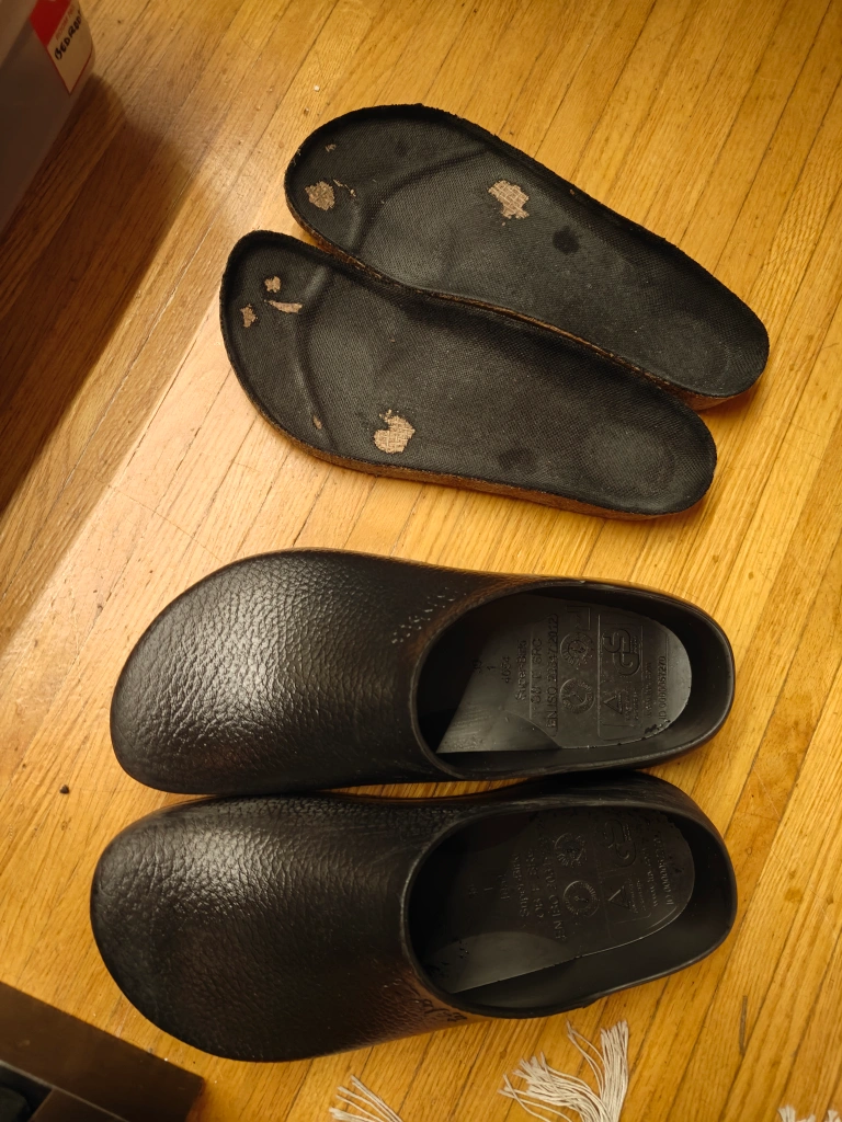 99Selling a pair of Birkenstock Super Birki clogs in size 39 (US 8-8.5 women's; US 6-6.5 men's). They show signs of wear on the inside, but are still functional. The outside and treads are practically brand new. Great for kitchen work!
