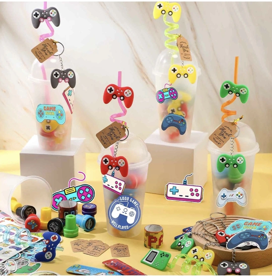 80Bulk lot of gamer-themed party favours. Includes cups, straws with controller keychains stickers, and stamps. Perfect for a video game party or event. Great value!