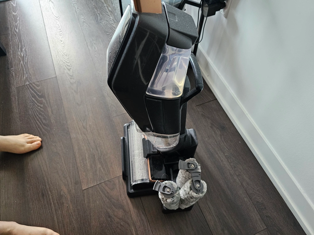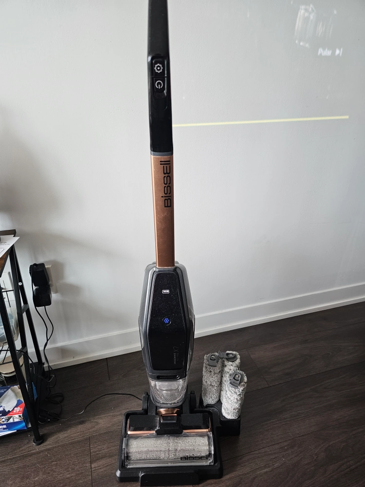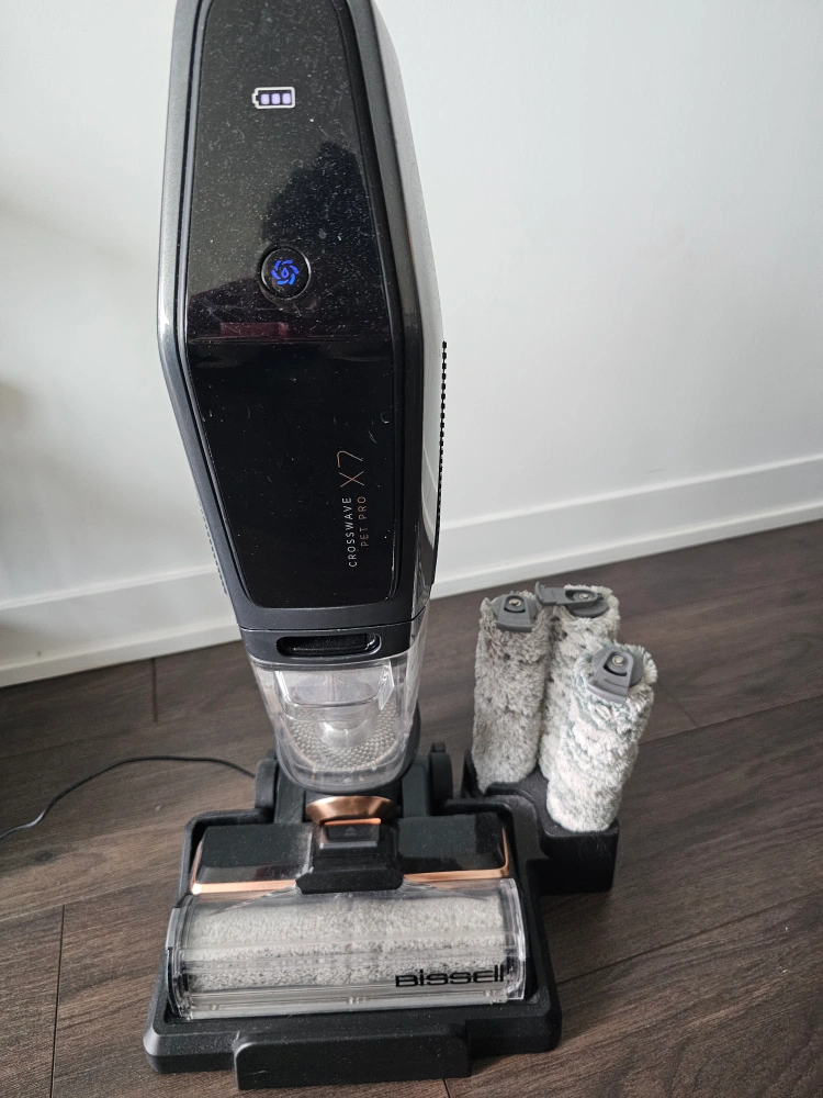A vacuum cleaner with a handle and a brush roller. It also includes a base with additional rollers. With this cleaner, you can maintain a clean space to help you relax. old version of this one: https://www.bissell.com/en-ca/product/bissell-crosswave-pet-pro-upgrade-multisurface-exclusive-wet-dry-vac-2303B.html